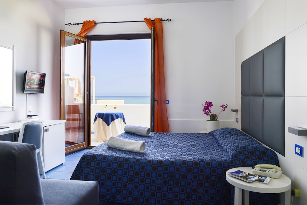 This family-friendly business hotel takes its name from the extraordinary location it enjoys right on the beach along the coastal road of Castellammare del Golfo, between 2 important provinces (Trapani and Palermo) and very close to Segesta-Erice-San Vito Lo Capo. The beach hotel is 3 km from the centre of Alcamo and other nearby towns and cities including Segesta (8 km), Erice and Trapani (both 60 km) and Palermo (50 km). Punta Raisi Airport is approximately 35 km from the hotel.Guests will find a friendly and discreet environment, and one which is an extremely pleasant place to spend a holiday. Facilities available to guests in the air-conditioned, 26-room beach hotel include a lobby with 24-hour check-out service, a hotel safe, TV lounge, cafe, breakfast/dining room, newspapers, tourist information and a private beach. Guests may also make use of the free WLAN Internet access and car park and, for an additional fee, they may take advantage of the room and laundry services and a bicycle hire service.The guests room are styled in typically Mediterranean blue and white tones to provide guests with a relaxing and comfortable atmosphere. All rooms are equipped with satellite TV, a telephone, wireless Internet access, a minibar, safe and air conditioning. Each room additionally features an en suite bathroom with shower and hairdryer, a double bed, direct dial telephone, ironing set and a private balcony or terrace.The hotel offers an outdoor swimming pool with children's swimming area in the summer. Sun loungers and parasols are provided free of charge by the pool and for a fee on the hotel's private sandy beach. Guests may enjoy a game of beach volleyball or go diving or biking (for a fee). The hotel organises an entertainment programme for adults.A continental breakfast buffet is served each morning, and set menu and à la carte options are available for lunch and dinner.
