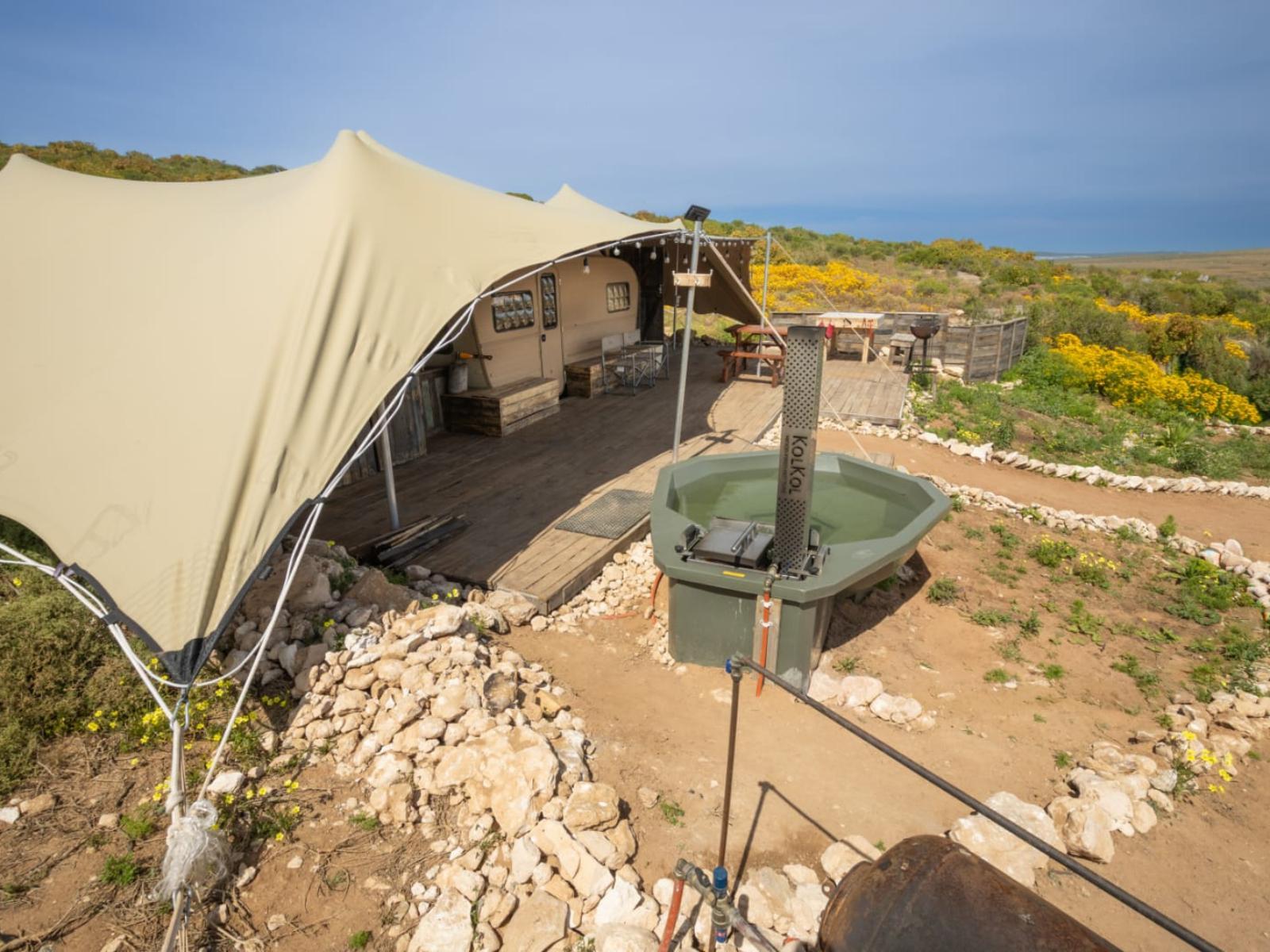 Discover Locum Igni, a classic glamping caravan nestled within the serene Langeverwacht Eco Retreat on Farm Langeverwacht in St Helena Bay. Perfect for a small family, this unit features a comfortable queen bed and a 3/4 bed for two children. The unit is equipped with a private shower, toilet, and an inviting wood-fired hot tub, offering guests the perfect balance of rugged nature and luxurious comfort.The unit's cooking facilities include a 2-plate stove, a microwave, and a bar fridge, making it easy to prepare meals. Guests can enjoy their food at the indoor dining area or take a