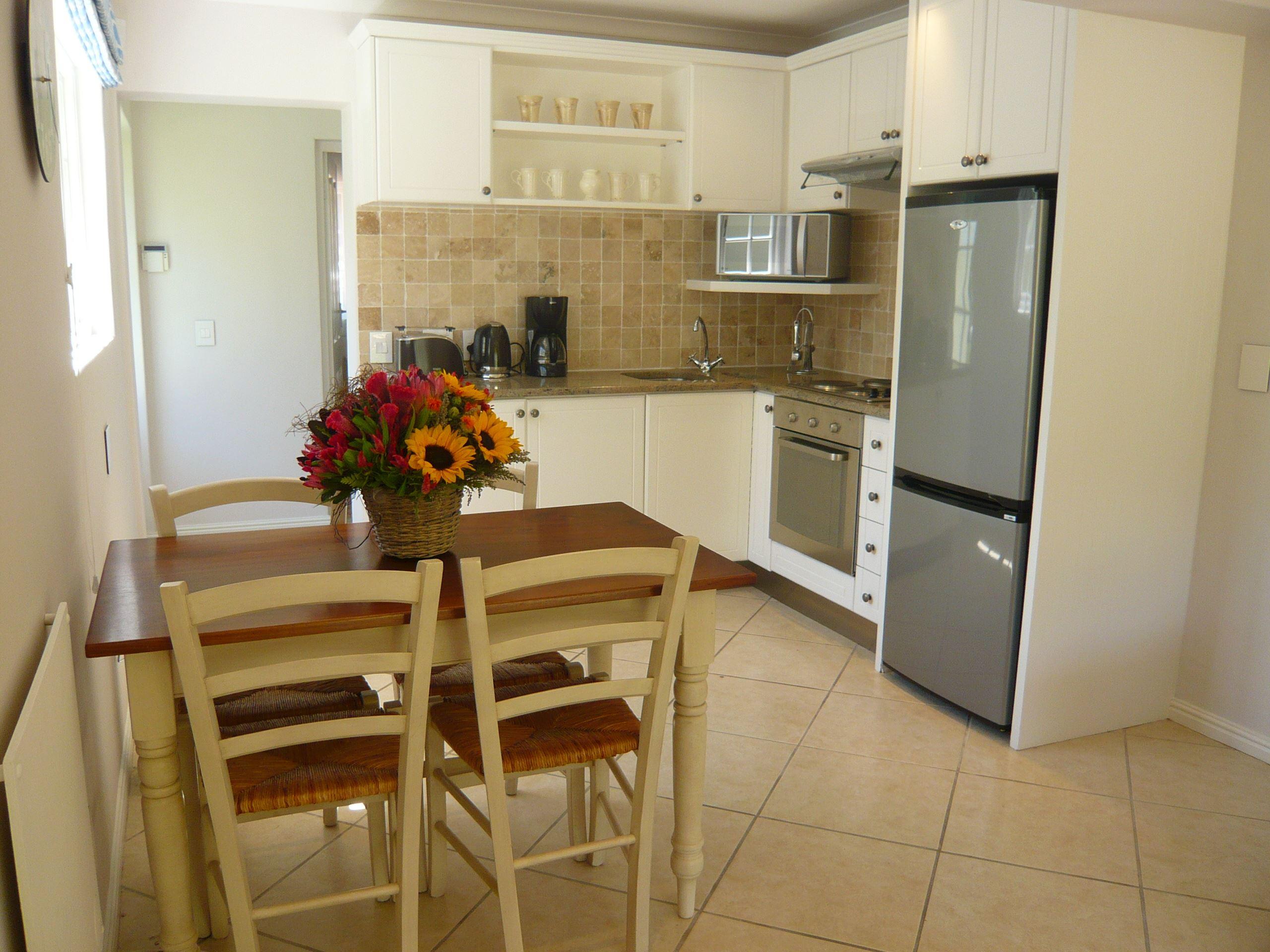 The cottage has its own secluded courtyard which overlooks the lush garden with mountain views and a sparkling swimming pool. It is comfortably furnished and fully equipped for self-catering, offering accommodation for up to four persons, children are most welcome. There is an open-plan living area with a kitchen, dining area and lounge that leads onto a private outside patio with braai (BBQ) facilities. The kitchen features a stove, hob, microwave oven, fridge/freezer, toaster, kettle, and coffee machine. The master bedroom has a king-size bed and en-suite shower, while the second bedroom has a queen-size bed with en-suite bathroom with shower and bath.