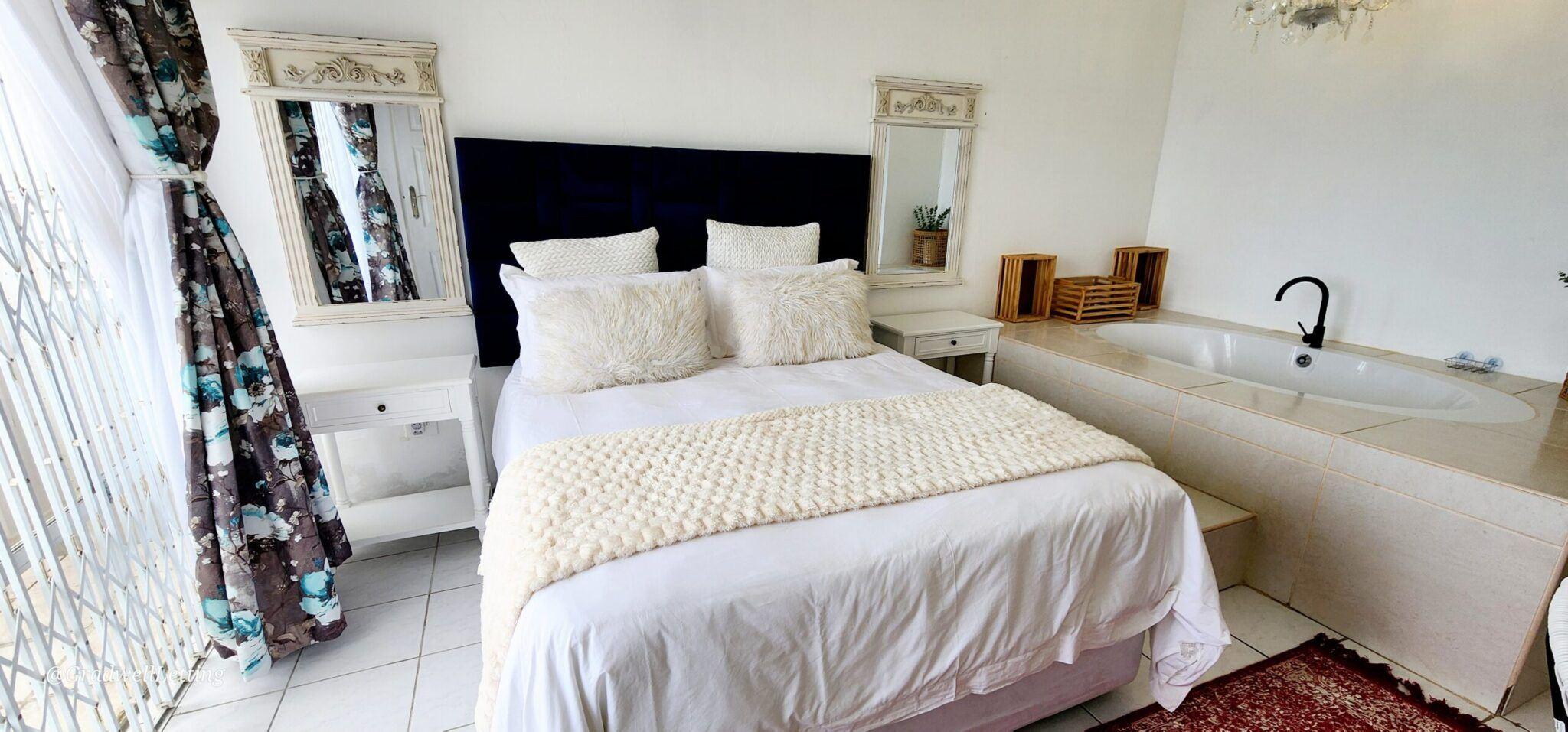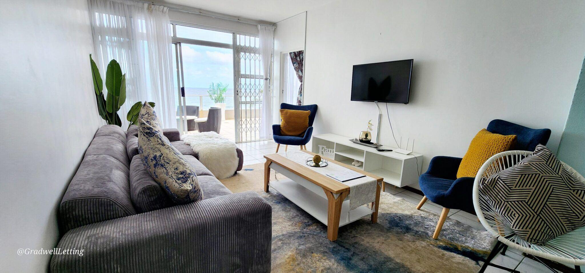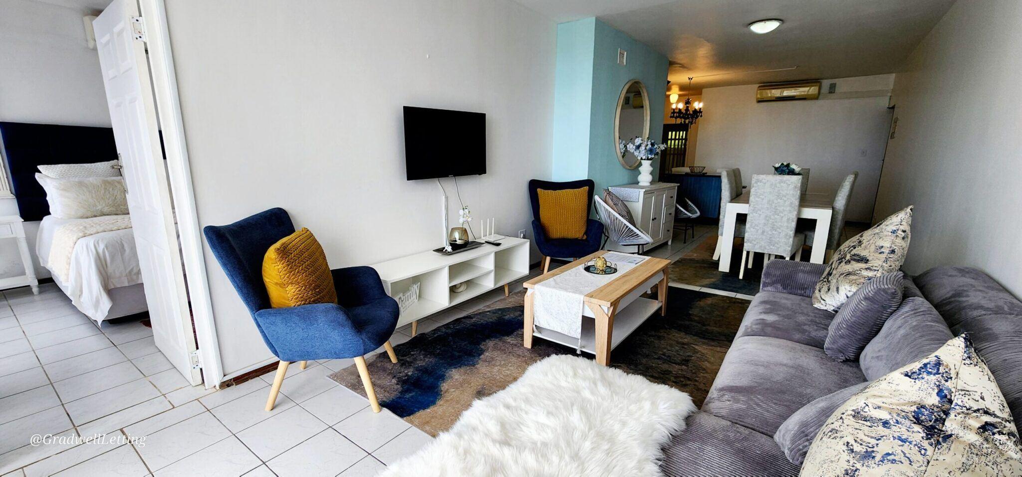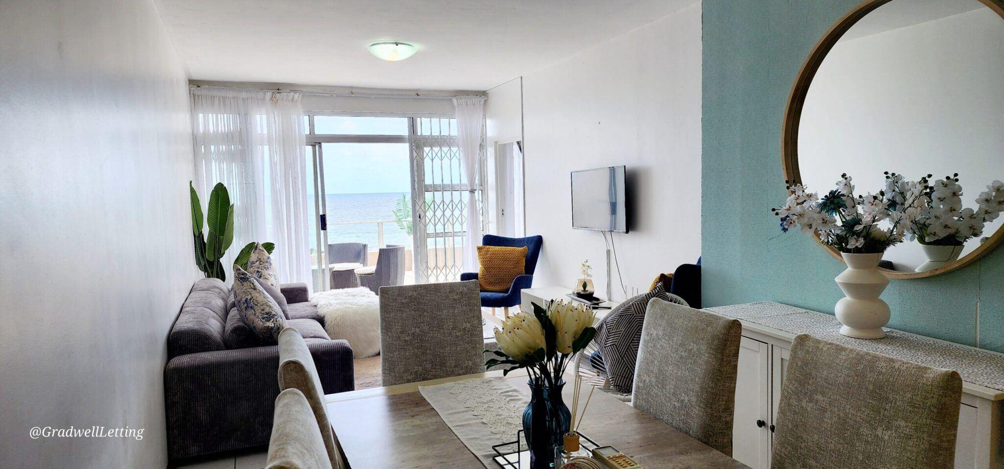 Libra 3 is a modern and beautifully decorated 6 sleeper, 3-bedroom, 2-bathroom unit, in a secure complex in Manaba, only about 100m to the Lucien beach and 50m from the Manaba tidal pool. It has stunning sea views from the large balcony area, lounge and main bedroom.The main bedroom is fitted with a king-sized bed, while the second bedroom has a queen, and the third bedroom is fitted with two single beds. All bedrooms are also equipped with ceiling fans, for your comfort.The main bedroom has a modern en-suite bathroom with an open bath area off the bedroom, and then a s