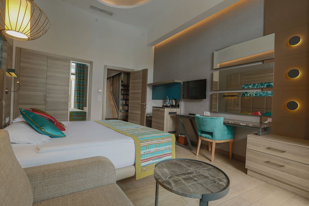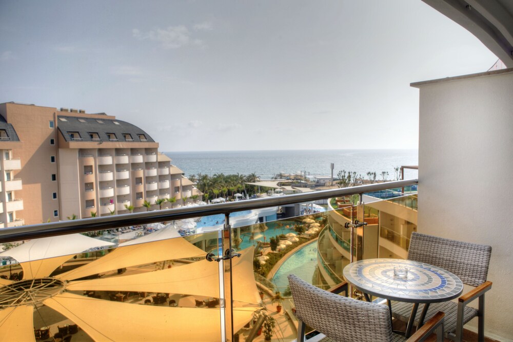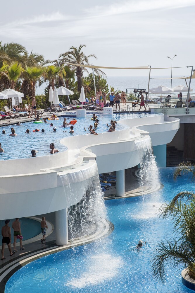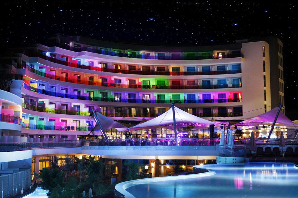 Located by a long, sandy beach on Turkeys beautiful Mediterranean coast, this modernly designed hotel with panoramic lifts, shares some leisure facilities with its sister hotel, situated next door. All the rooms are very spacious and luminous, tastefully decorated and equipped with modern amenities to ensure a pleasant stay. The resort features an extensive spa centre, impressive conference facilities, a lunapark, aquapark and sea and fresh water swimming pools. The beautiful beach is enriched with 2 private jetties from where privately-operated watersports run. The popular resort of Alanya with its great shopping areas and imposing cliff top castle is a 15-minute car ride away. Guests will find public transport and a taxi rank at the hotel entrance, which will allow them to explore the area.