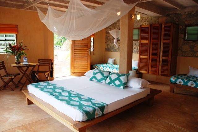 Located on a large area covered by jungle and forest, Loumoon Lodge – Family Bay lies amidst a beautiful bay surrounded by sandy beaches.The lovely double storey offers guests a choice of four rooms situated on the upper or lower level. All the rooms are air-conditioned for comfort and enjoy lovely views from the balconies. The Bay View Suite has two bedrooms furnished with a double and single beds, as well as a shower-only bathroom. The rooms have private entrances as well as an interleading door. The Bay View Room is located on the first floor and is furnished with a double b