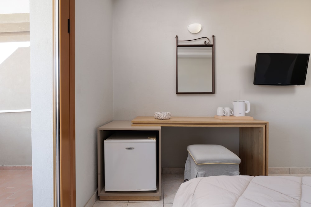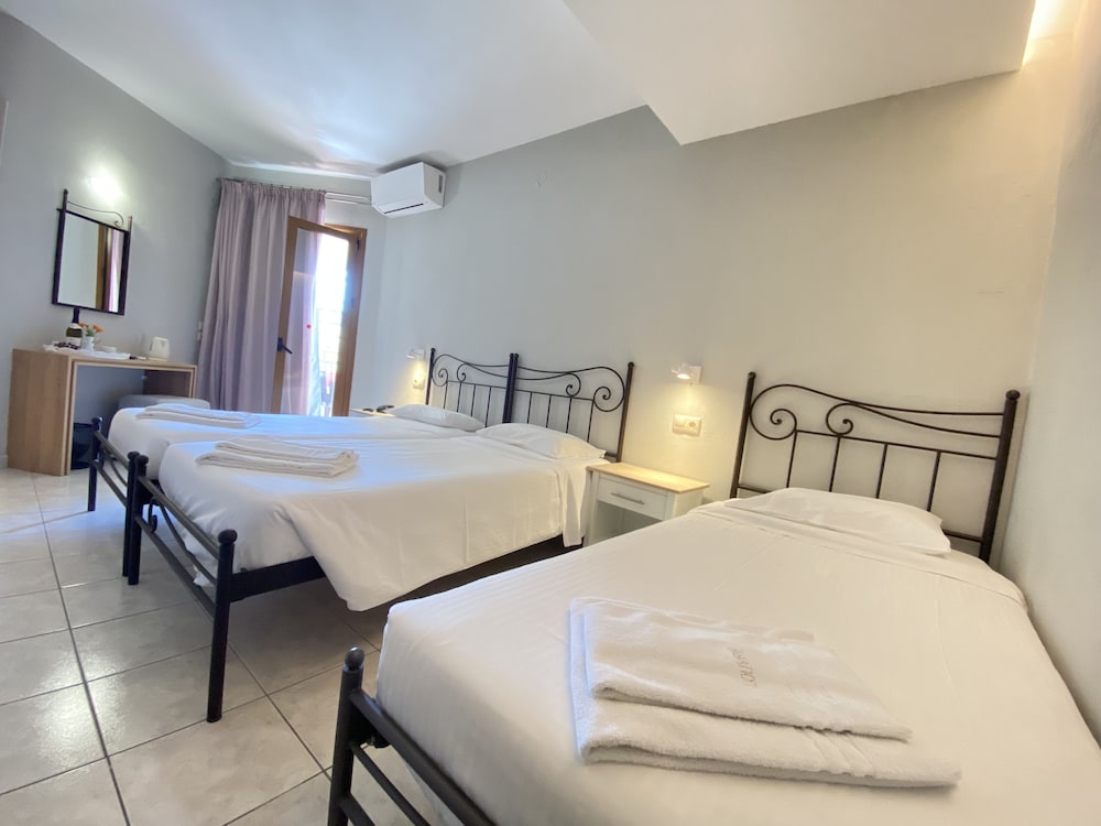 The hotel is surrounded by lush evergreen gardens and is located just 150 m. from the beach of Gouvia, near the old Venetian shipyards.Originally built in 1986, the hotel was renovated in 1996 and is a peaceful, well-maintained, family-run business with a friendly atmosphere and excellent service, offering a relaxing and carefree holiday. It comprises a total of 25 guest rooms. It offers an entrance hall with reception, a restaurant, a bar, a snack bar, an automatic telephone operator, safety deposit boxes and currency exchange. There is also a terrace, a lounge with TV, central heating and free private parking. Room service is also available.The comfortable heated rooms come with private bathroom, direct dial telephone line and pool or village view balconies. They also feature individually adjustable air conditioning and central heating. Extra beds and baby cots are available.There is an outdoor swimming pool, complete with sun loungers, parasols, freshwater showers and a poolside snack bar.