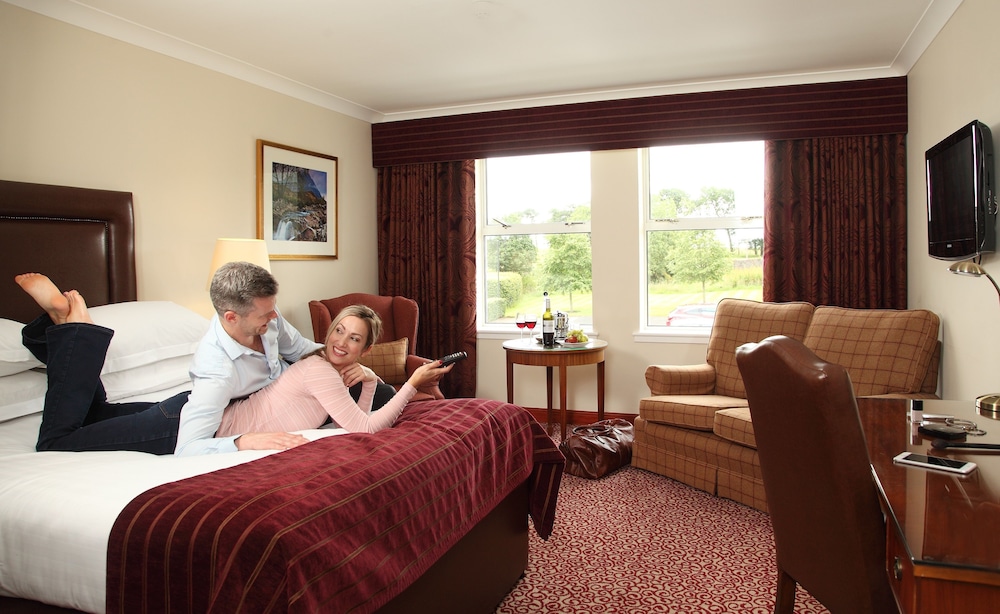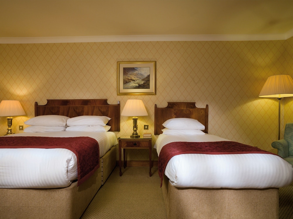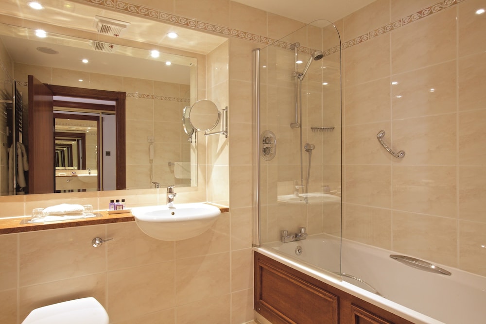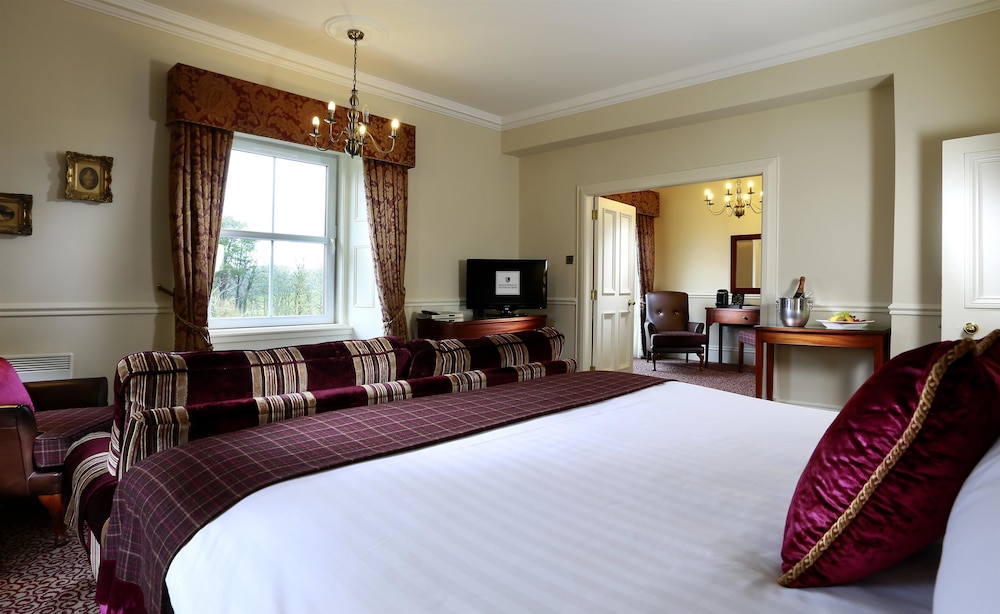 Facilities and services include restaurant, bar, indoor swimming pool, parking, safe at reception, elevator, wireless Internet access, gym, spa (extra charge), sauna (extra charge), meeting room, business center and 24-hour reception.Rooms feature heating, wireless Internet access, TV, telephone, hairdryer and bathroom.Executive rooms also feature luxury toiletries, bottle of wine, DVD player, bathrobes, fruit bowl and sofa. Suites feature four-poster bed and chocolates.Address: Strathaven Rd, G75 0QZ Glasgow, Scotland, United Kingdom.