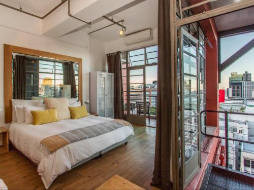 The Manhattan luxury studio with hot tub in bathroom - perfect honeymoon delight - open loft style furnishings - 70 sq meterloft apartment with modern luxurious decor , high ceilings offering a spacious loft feel and balcony. 180 degree Panoramic views of Cape Town . Situated on top of a hotel with pool and indoor security parking . Step out on to Bree street , the most happening street in Cape town ! Top restaurants and Coffee shops ! The studio offers a lovely Jacuzzi designed bath with proper jacuzzi jets and extra large tub designed for 2 people.More informationThe space