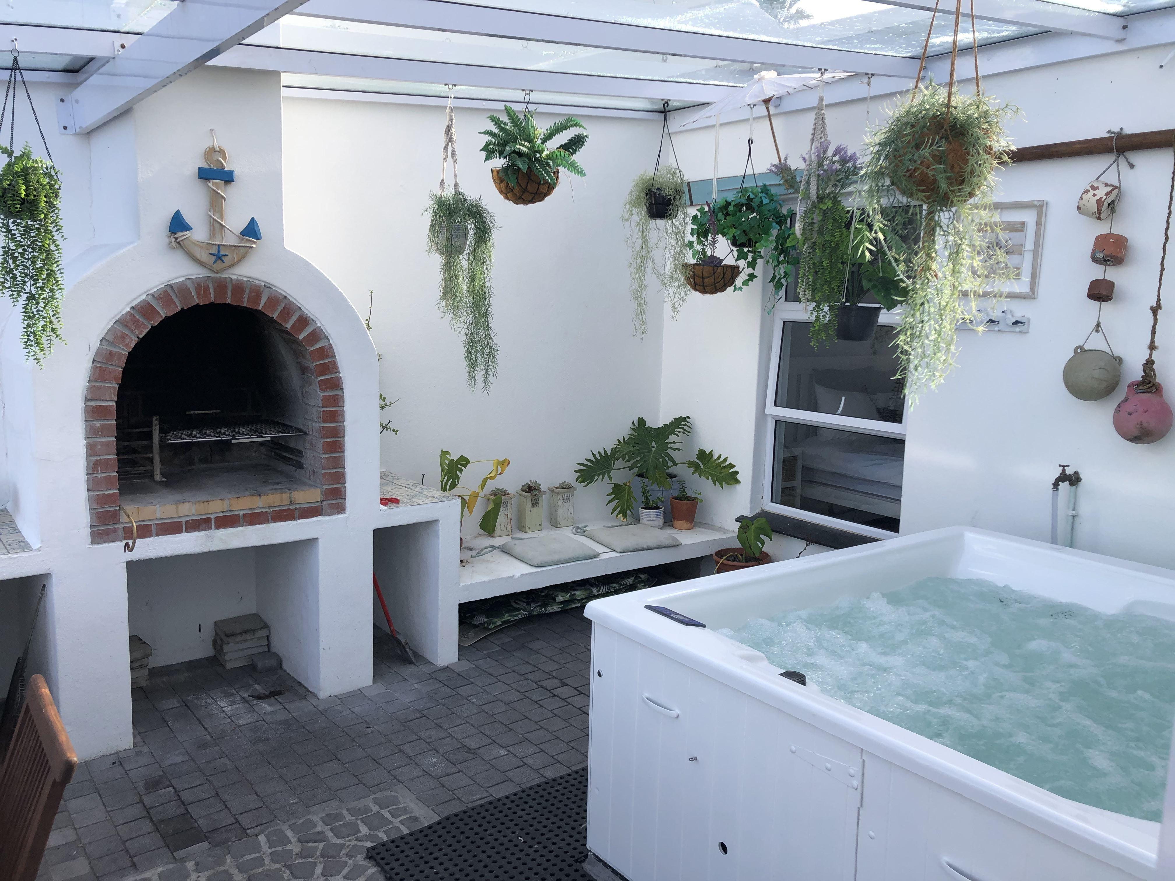The kitchen is fully equipped for self-catering and has a fridge with an ice machine, dishwasher, large oven and a microwave. The dining area has a table with seating for 8 and 4 extra chairs are provided. The kitchen and dining area open onto a sheltered courtyard with a picnic bench and Weber braai facilities. The lounge has two single sofa beds, an Apple TV with DStv via high speed internet, and leads onto the sheltered glass braai area. There is a Jacuzzi and leads to a beautiful deck on the water with outdoor furniture.