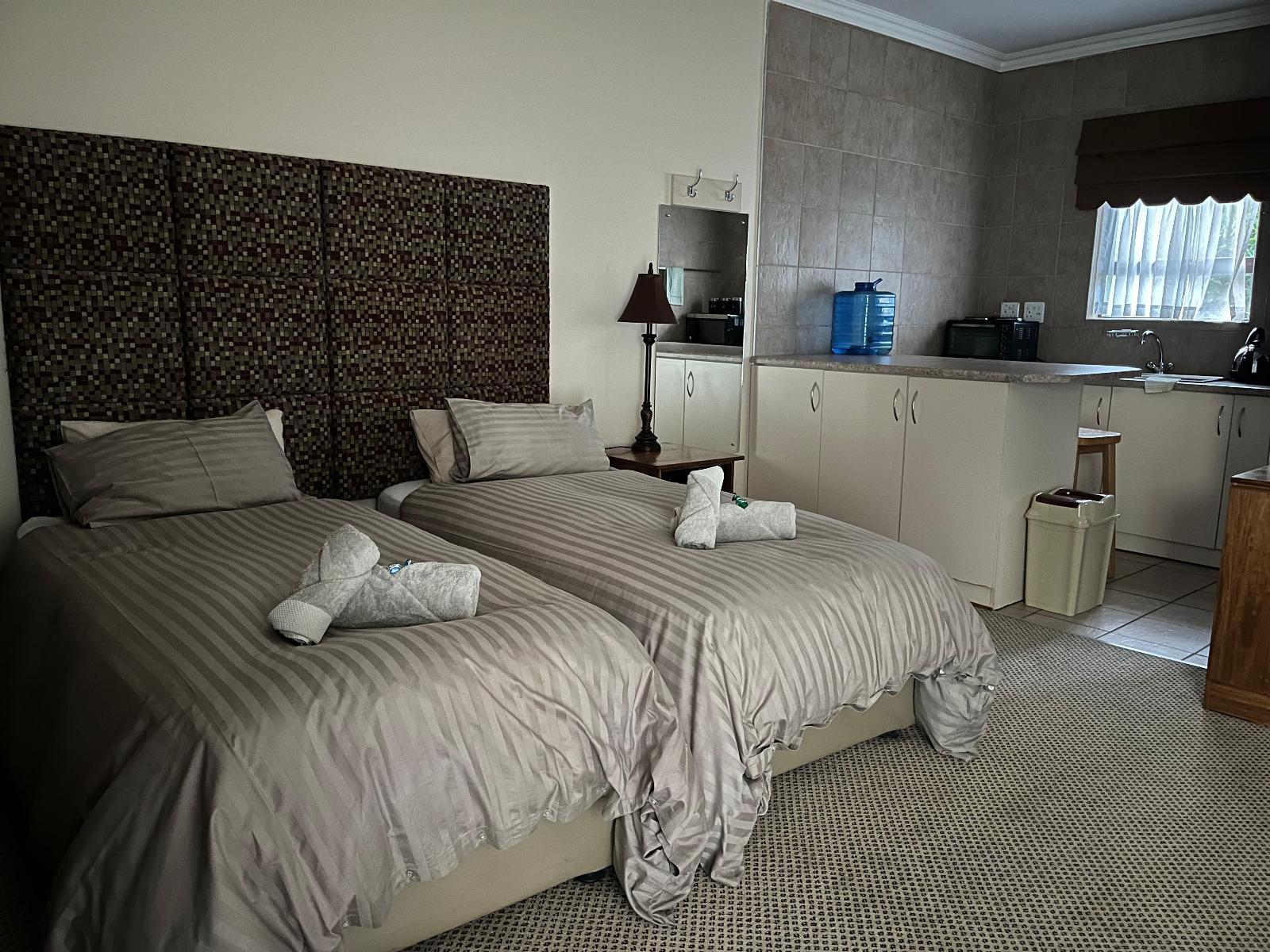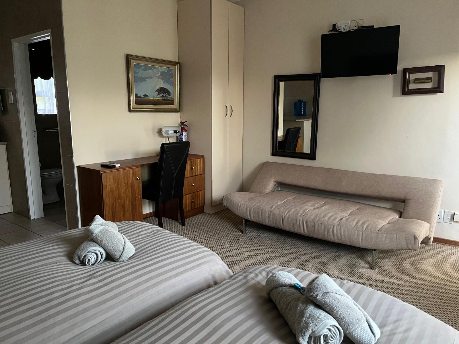 Matthys Guesthouse is situated in the tranquil residential area of Rhodesdene, Kimberley, Northern Cape. Known for its peaceful suburban atmosphere, the guesthouse offers a calm retreat for travellers. Its location provides easy access to the city while maintaining a quiet environment ideal for relaxation.The guesthouse features well-furnished rooms, each designed to ensure comfort and convenience. Each room includes a cosy bed, an en-suite bathroom, air conditioning, a bar fridge, a microwave, a toaster, a desk, coffee/tea facilities, a TV, and Wi-Fi. These amenities make the room