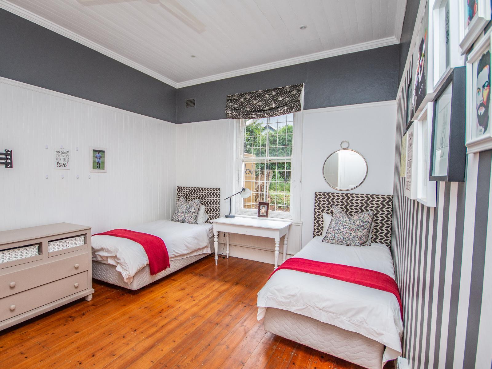 Mimosa Bed & Breakfast is situated in Grahamstown, the educational and festival hub of the Eastern Cape Makana Region. TMimosa Bed & Breakfast is able to accommodate up to four people in this private unit. The large, elegant main bedroom is tastefully furnished including a king-size bed and boasts a Victorian fireplace, sitting area and TV. The second bedroom, also with a Victorian fireplace, is comfortably furnished with two single beds. Both rooms have access to a private veranda which overlooks a beautiful garden and an elegant charcoal swimming pool. A private bathroom an