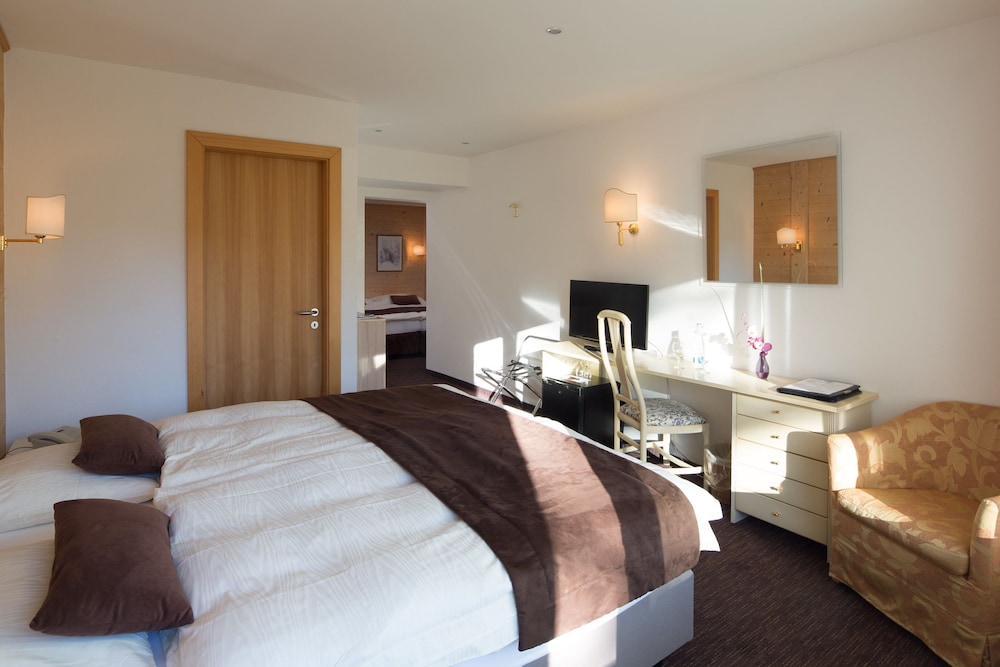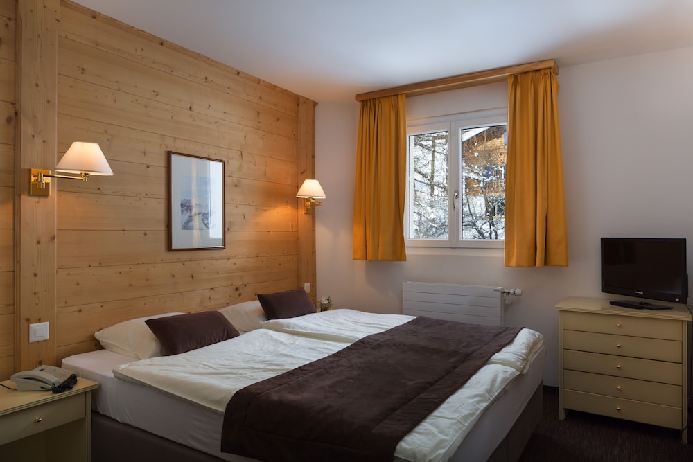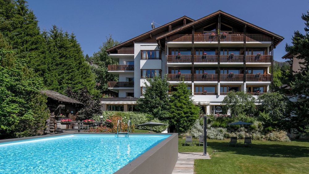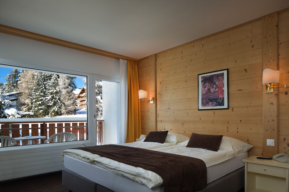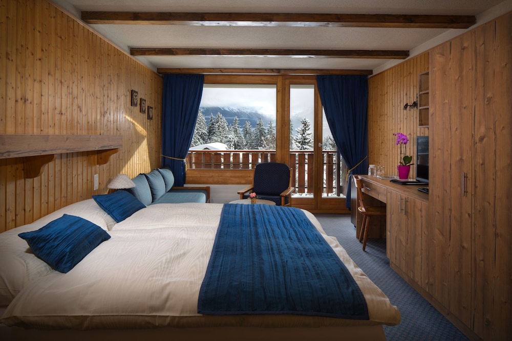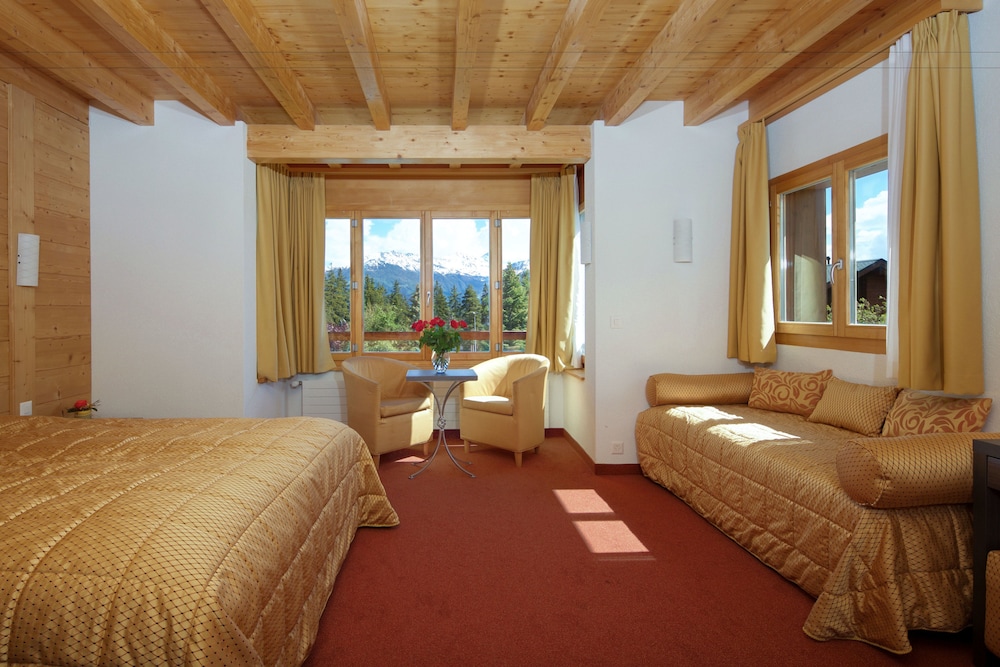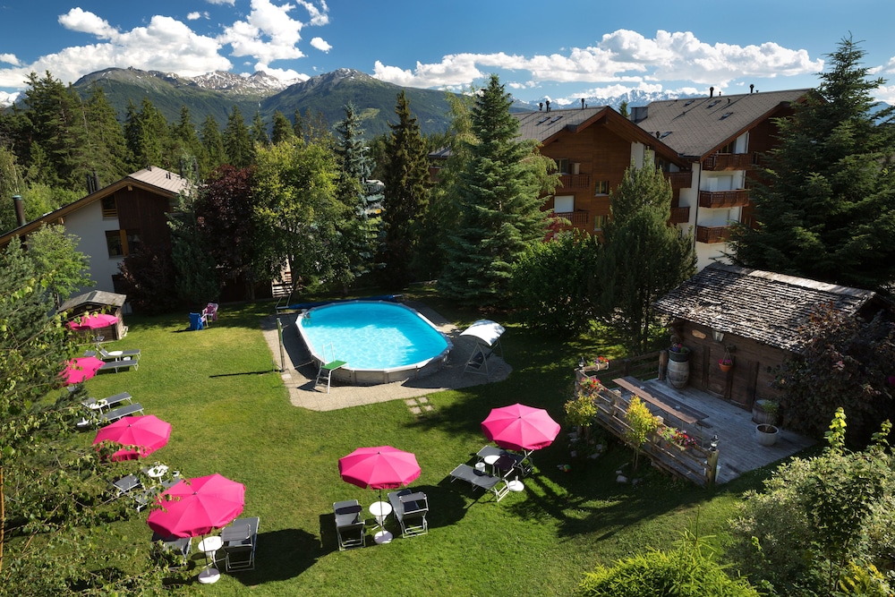 The worldfamous resort of Crans-Montana is located at 1.500 m high on a southfacing sunny terrace above the Rhone Valley in the Valais, sheltering the most beautiful golf courses, clear mountain lakes and a skiarea that includes a glacier of 3.000 m above sea level. The hotel is situated quietly next to the forest and to the Moubra Lake at walking distance of all attractions, sports and fun infrasctructure, bus and funicular stations, shopping facilities and nightlife. About 15 km from Sierre.The hotel offers all modern comforts and features a restaurant with bar and a dining room with terrace, conference facilities, lift, WiFi-internet connection, garage and free car park, children's playground and playroom and a magnificent, sunny garden with a swimming pool.The bright and comfortable rooms features ensuite bathroom with bath or shower and wc equipped with hairdryer, a balcony, WiFi-Internet connection, cable-TV, radio, direct dial phone, minibar and minisafe.Solar-heated outdoorpool (1m35 deep) embeded in a magnificent and calm garden where sun loungers and parasols invites to a recreative sunbath.From motorway A9 take exit 28-Sierre-Ouest and follow direction Crans-Montana. Arriving in Crans at the first roundabout turn right (1st exit) into Route Cantonale which became Route de Crans-Montana after 1.8 km. Continue on this street for 2.2 km, then turn right into Route de la Moubra. On the roundabout after the forest take 1st exit Route de la Prairie. The hotel is on the left side after 220 m. In public transport: reach Sierre by SBB-CFF trains, then take the funicular until Montana Gare or the bus (via Mollens). From there take left (Av. de la Gare) and in the roundabout left into Route de la Moubra and then Chemin du Paradis. The hotel is on the right side after 600 m.