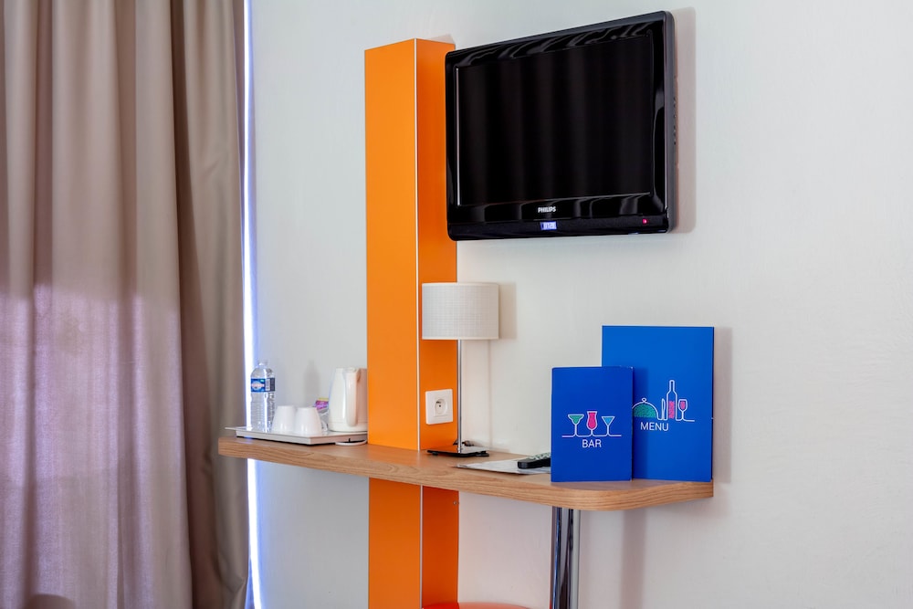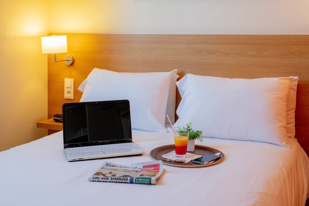Close to the major southern roads and the city centres of Toulon and Hyères les Palmers, the hotel occupies a much envied position on the Varois coast. Comprising a total of 42 rooms, this air-conditioned hotel welcomes guests into a reception hall with 24-hour check-in and check-out service. The hotel offers a cloak room, breakfast room, conference facilities, Internet access, garage and a car park. The en suite rooms are remarkably spacious and most have terraces or balconies. Each room comes fully - equipped with a double bed, telephone, TV and a kitchenette with mini fridge. The rooms also have centrally regulated air conditioning and heating. Guests can make use of the hotel's lovely outdoor pool. A breakfast buffet is served daily in the breakfast room.