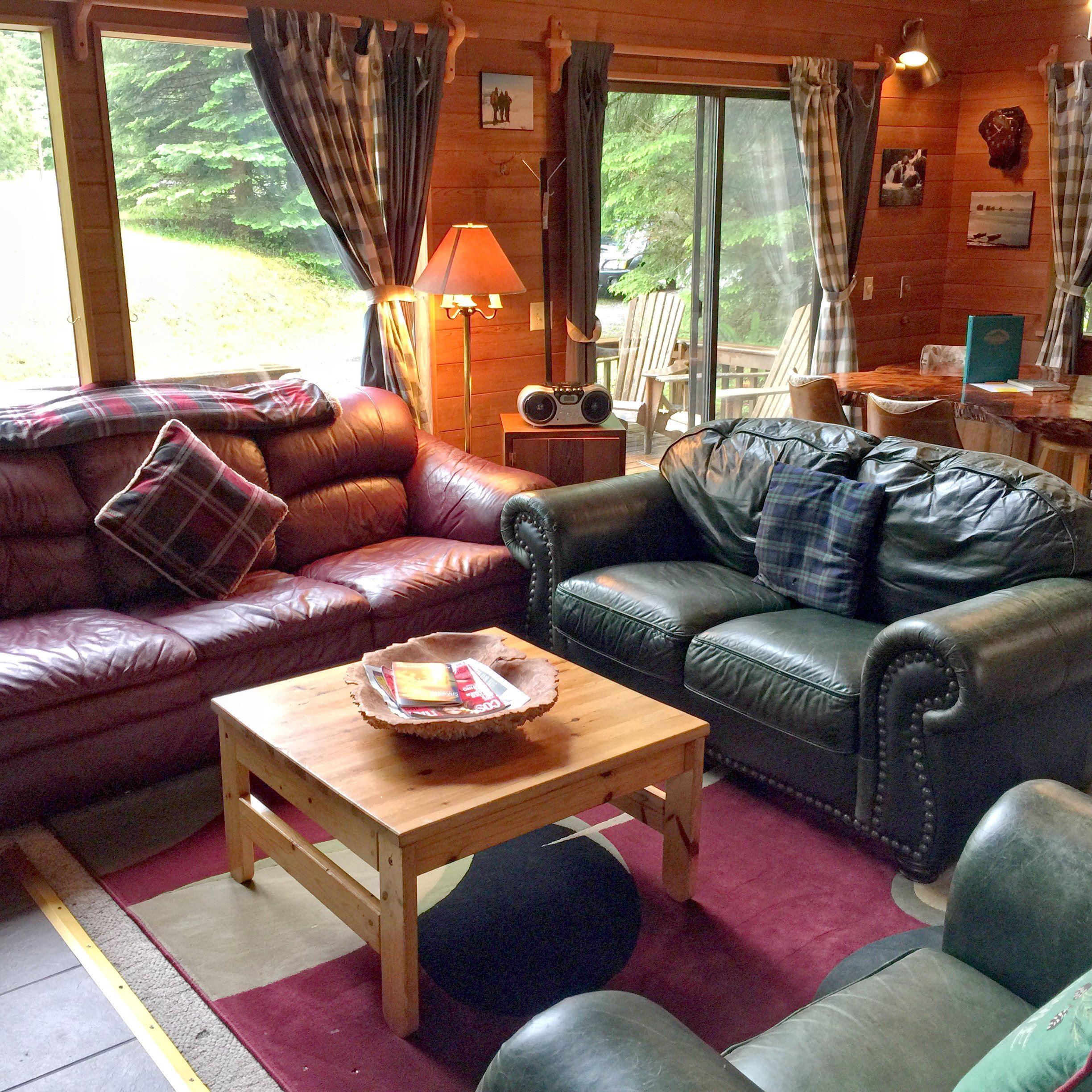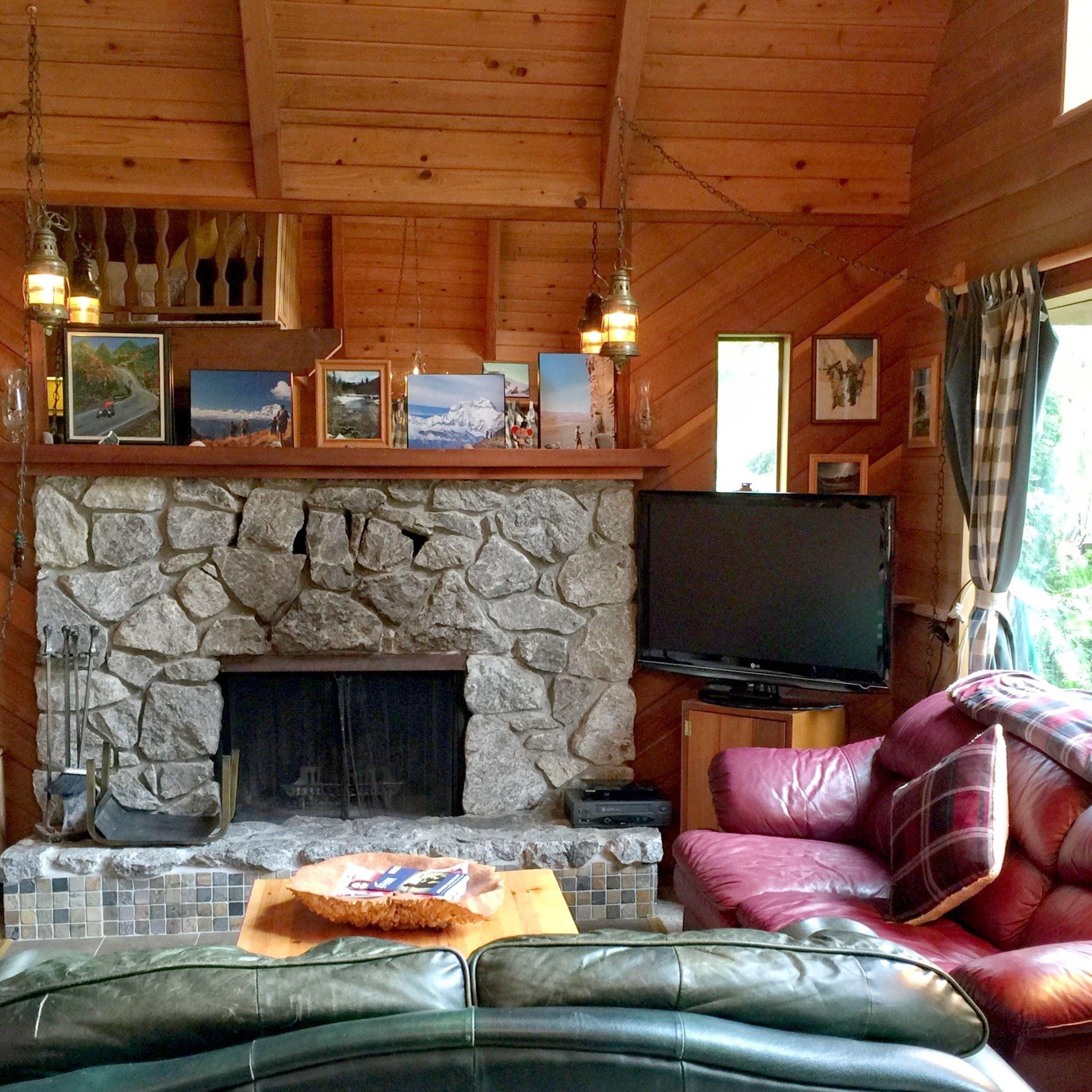The 1st floor of this cozy 2-story family cabin features an open living/dining area with a great open-hearth wood-burning fireplace (firewood provided), a well-equipped kitchen providing a 4-burner stove, microwave, dishwasher, coffee maker, toaster, and basic cookware/flatware/glassware, plus one bedroom with 1-queen sized bed, one full bathroom, and a laundry cubby with a stack washer/dryer. The 2nd floor is an open loft sleeping area overlooking the living area and includes 1-full sized bed and 2-twin sized beds. Last but certainly not least...at the back of the cabin you will find a great