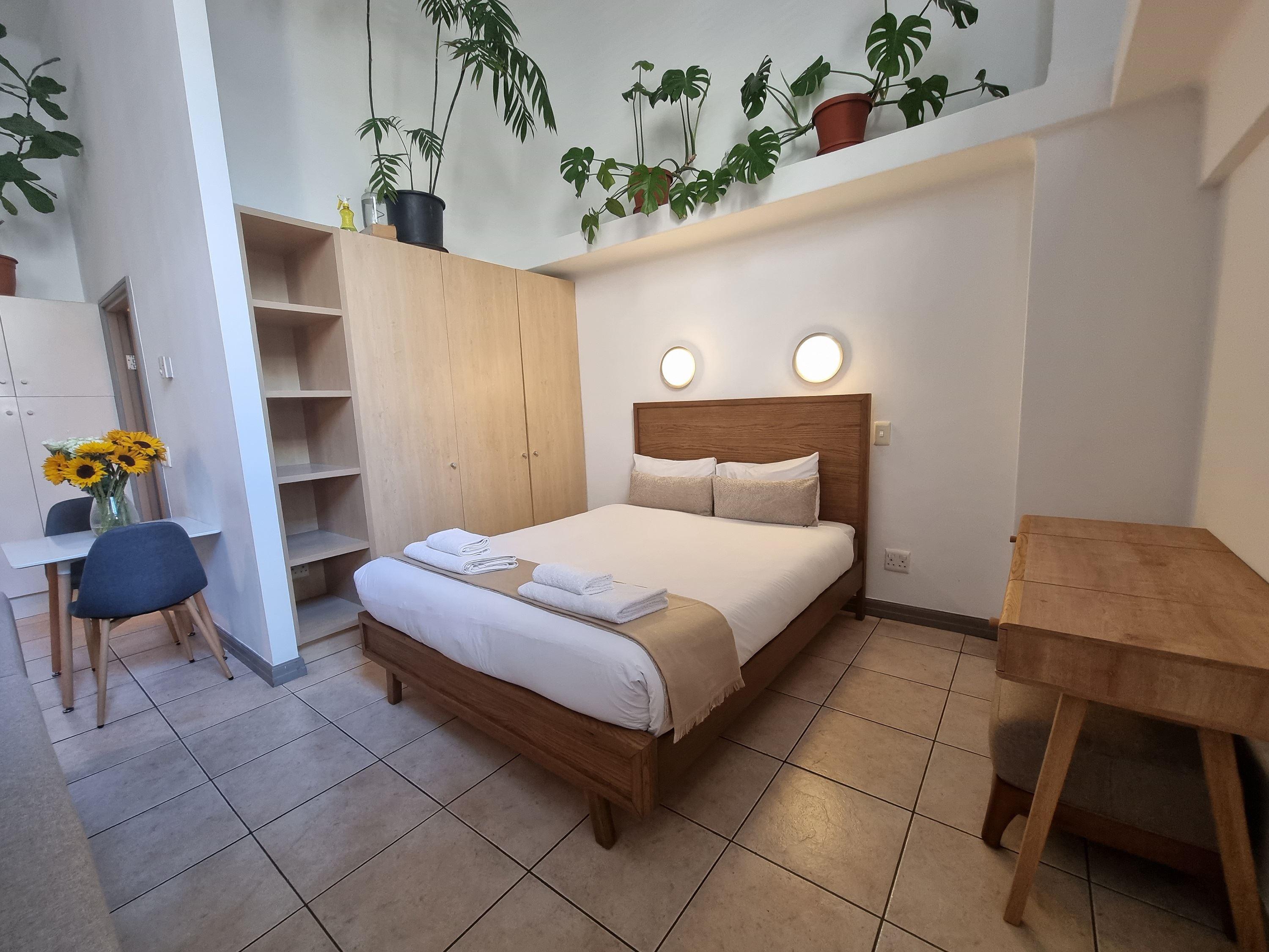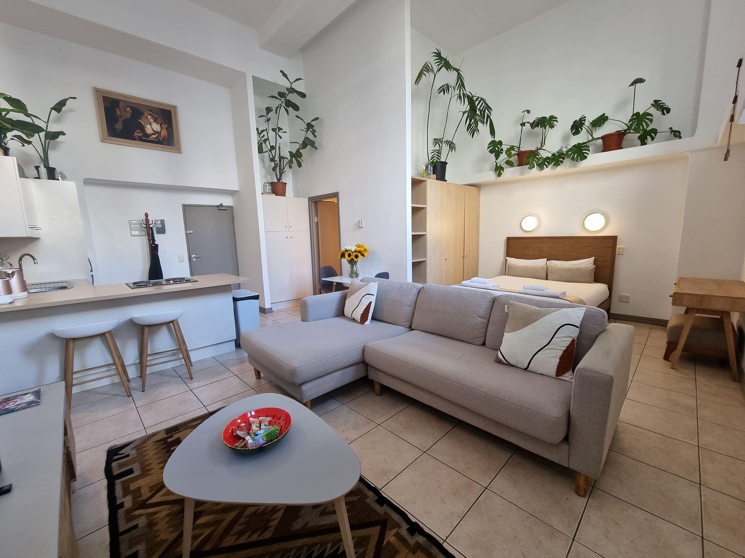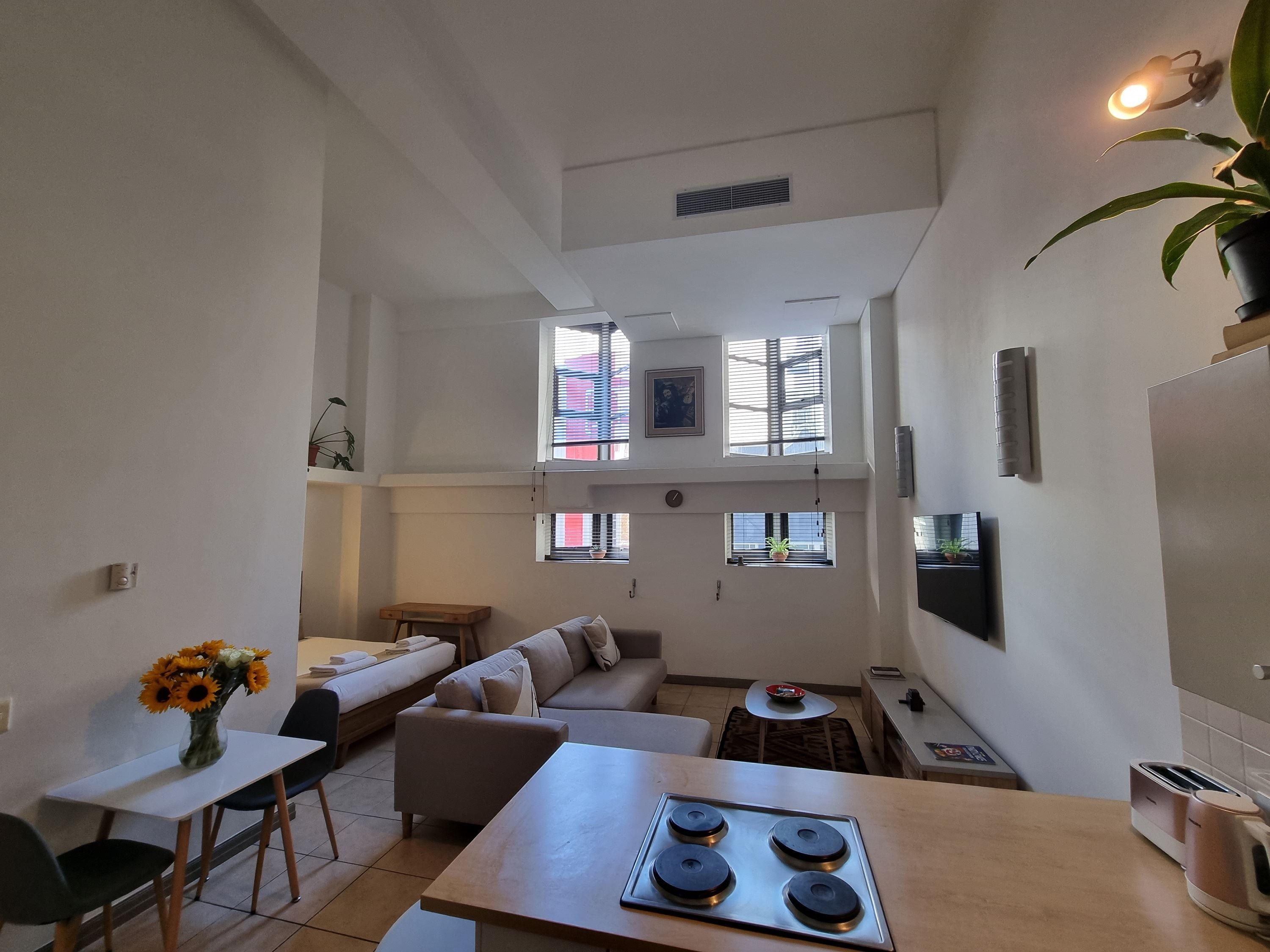 This stylish studio apartment in the heart of Cape Town City Centre boasts soaring high ceilings that create a sense of spaciousness and grandeur. The open floor plan maximizes the use of the available space, with a comfortable living area, a compact kitchenette, and a separate bathroom. Large windows allow ample natural light to flood the space, offering panoramic views of the cityscape or nearby attractions. The high ceilings add a touch of elegance and character to this urban oasis, making it an ideal choice for individuals or couples seeking a modern, airy, and centrally located accommodation option in Cape Town.
