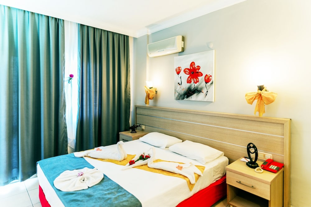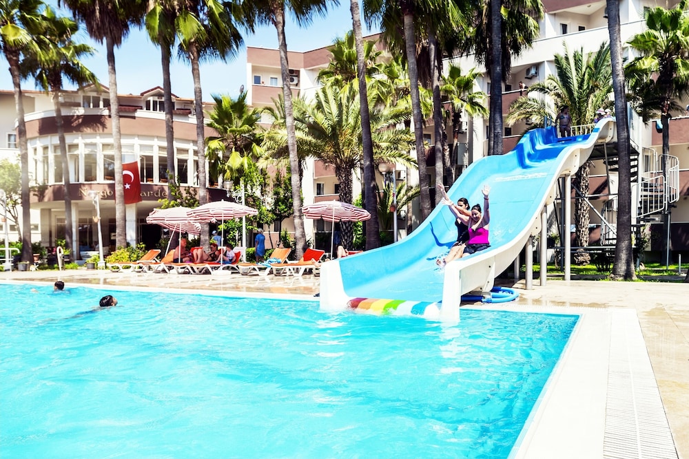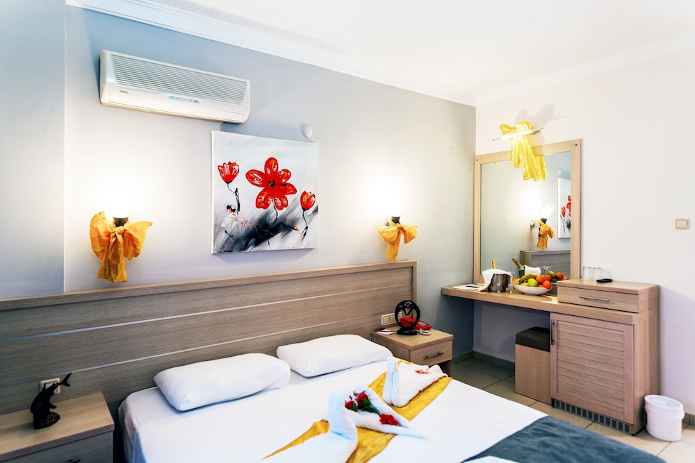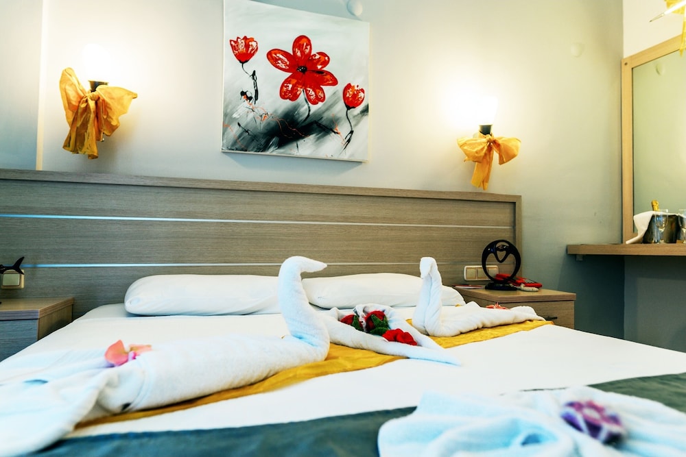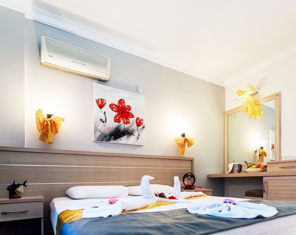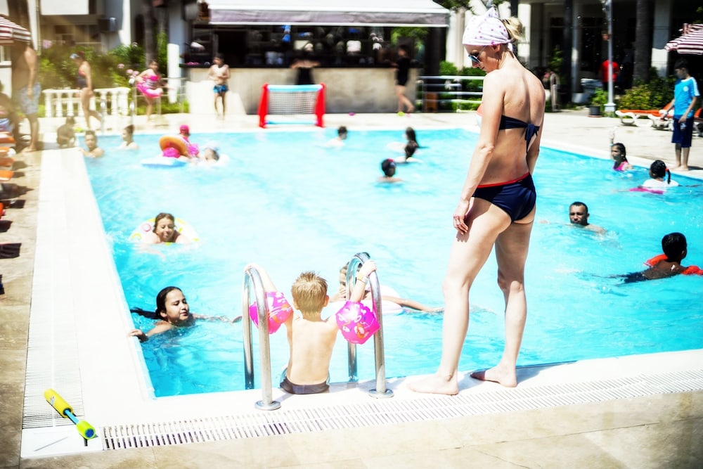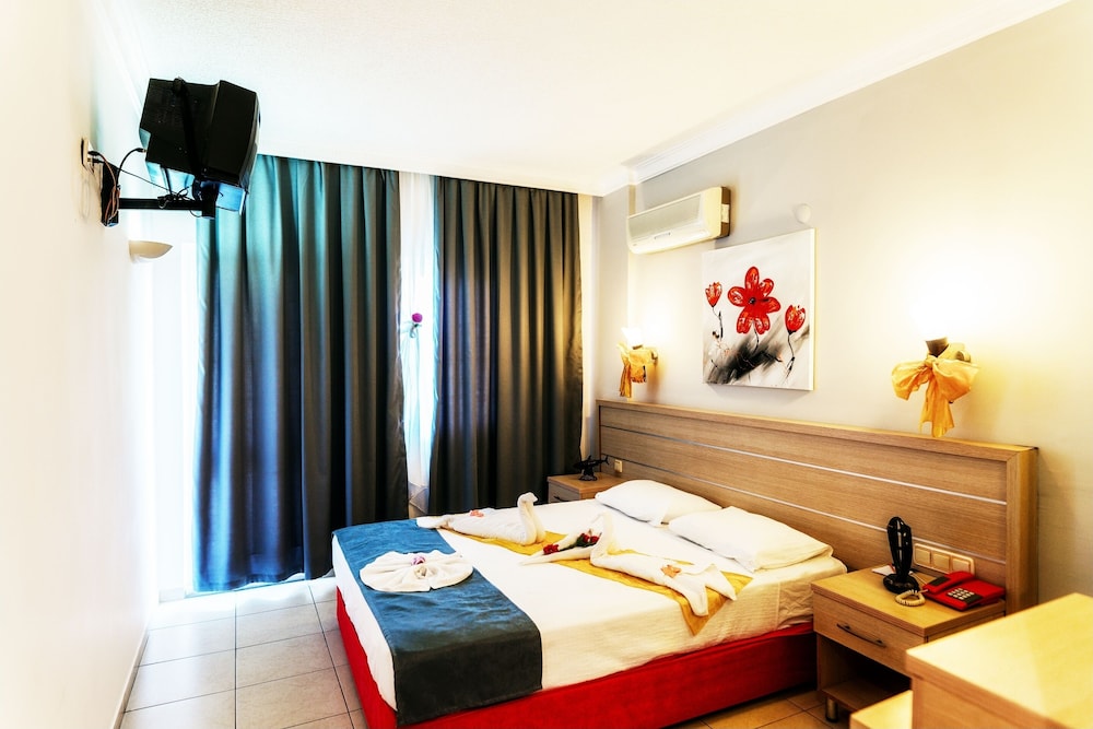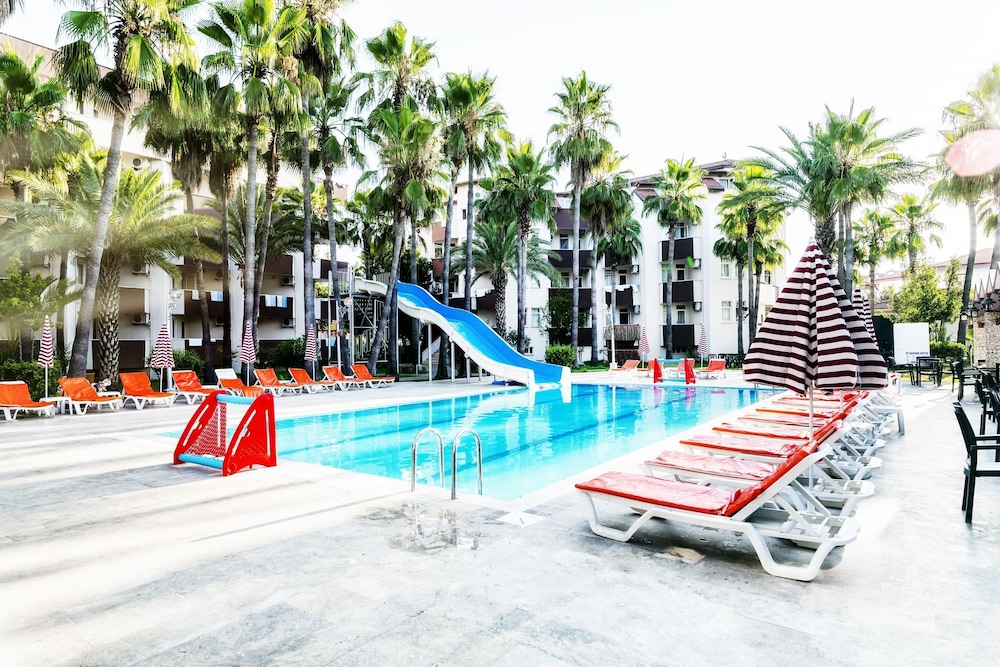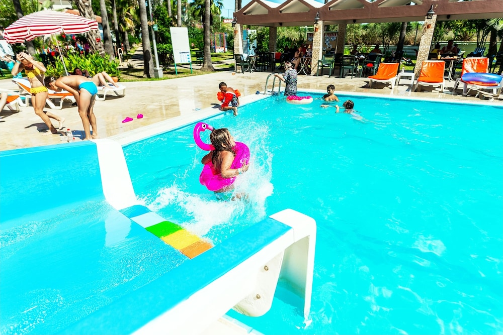 This lovely holiday hotel is located within walking distance from the centre of Çolakli and 350 m from the beach (free shuttle service). The historic town of Side with its ancient sites is 9 km away, the airport of Antalya 55 km. The hotel offers 102 rooms, 24-hour reception, currency exchange, TV room, restaurant, 3 bars, outdoor pool, children's pool, mini-club, wellness, medical assistance and laundry service.