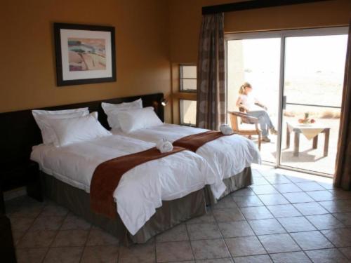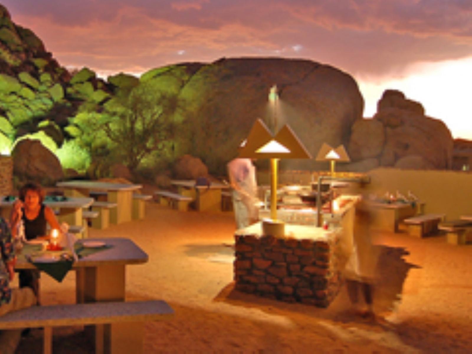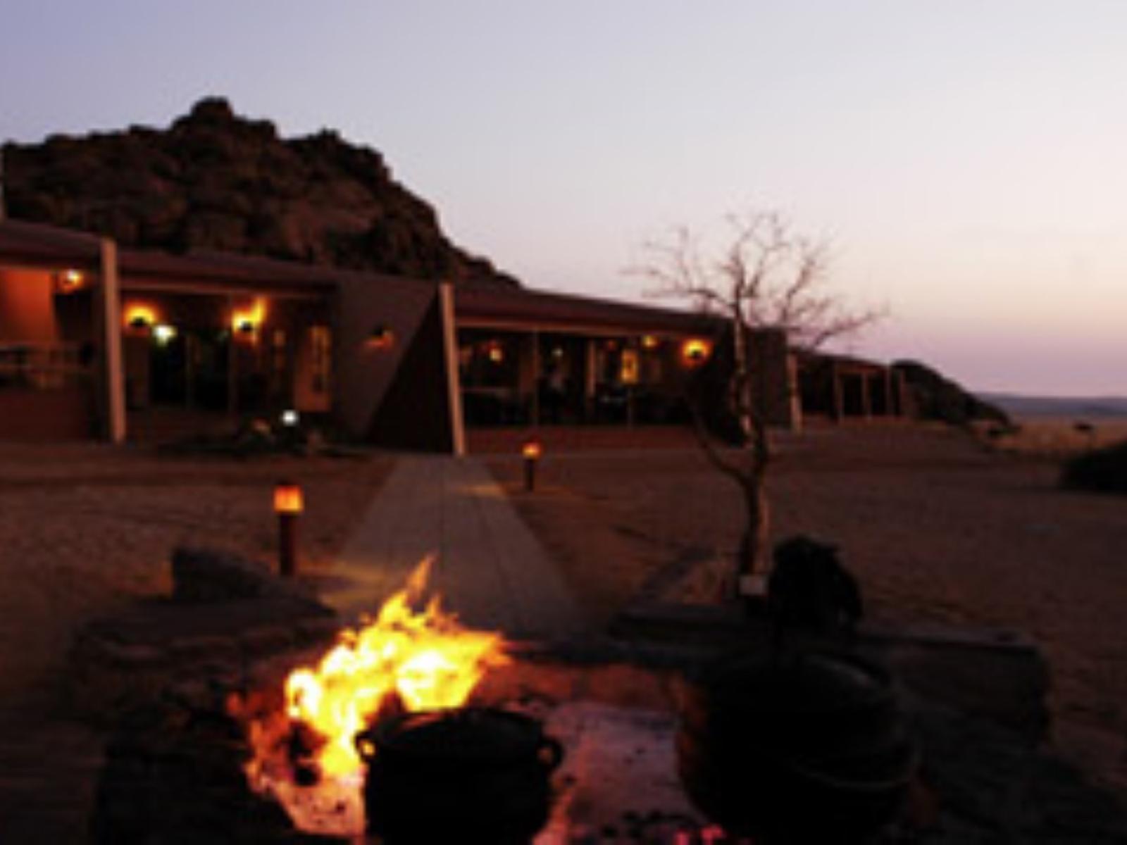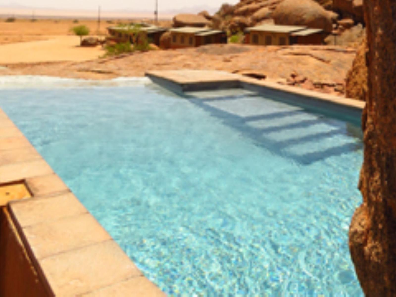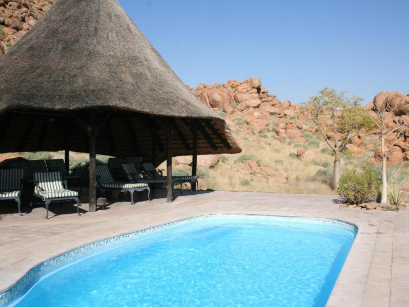 The Lodge features 15 comfortable double and two single rooms. All have their own private patios, en suite-facilities and fans; the main building of the Lodge sports a spacious veranda, a lavish lounge and bar area, dining room and an outside boma, where guests can enjoy the sparkling African sky during a cosy barbeque evening. Indigenous plants and swimming pool 'with a panoramic view' enhance the overall beauty of the Lodge, complimenting the surrounding granite hills and landscape in earthy colours. Clean desert air, beautiful sunsets and panoramic vistas make your stay a special and unforgettable one. Children welcome under parents supervision.