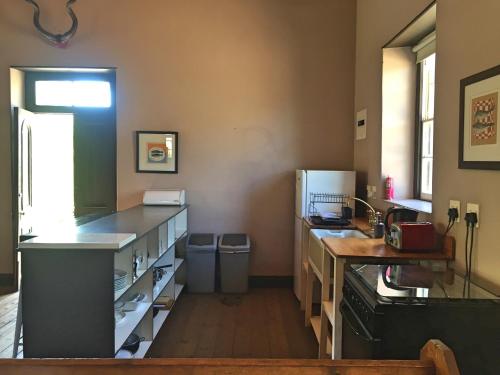 The Old School House has a large open-plan lounge, kitchen dining room area with a central wood-burning fireplace. The kitchen is fully-equipped for self-catering. It has a four plate electric stove top, an electric oven, a microwave and a full-standing fridge and freezer.