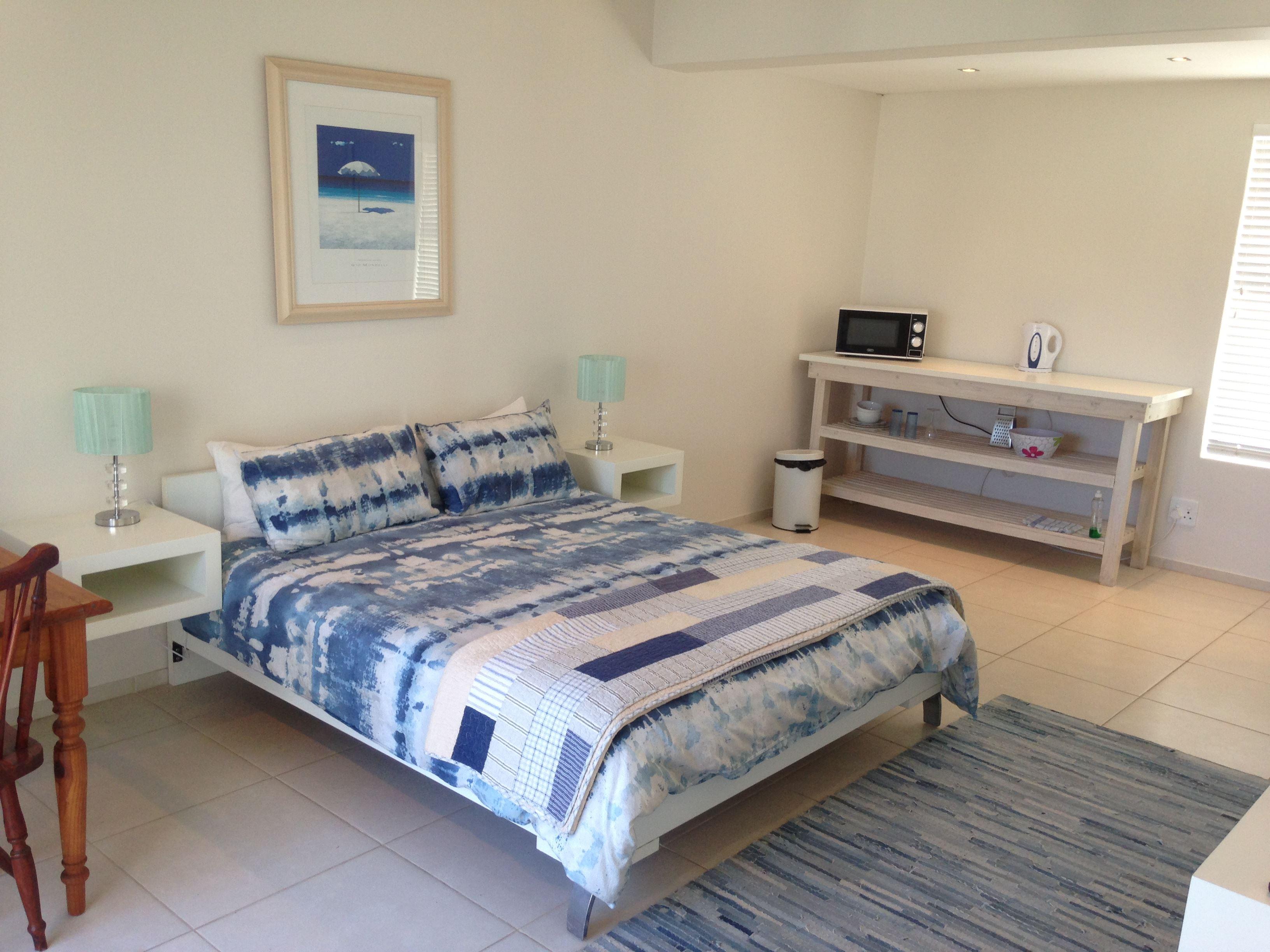 This unit is a semi self-catering motel room. The unit has a small kitchenette with a kettle, bar fridge, microwave oven, cutlery and crockery only. The unit does not have a kitchen sink, hob or oven to cook with.Hand towels provided please bring your own bath and swimming towels. It features a sunny north facing balcony leading to the entrance garden. For your saftey the unit has an alarm, remote and separate entrance. If you want to braai that will depend on if the front house has been let separately or not but if not you are welcome to use the front garden and braai.