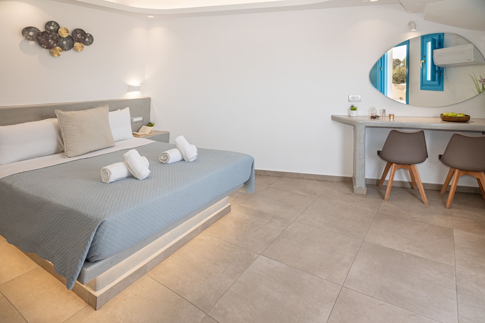 Located on the black sandy, 7km long beach of Perissa this hotel provides a quiet setting close to the town centre and just 8 km from the port. Its guests will be at a kilometre from the ancient town of Thira and 3km from the traditional village of Emporio, both worth visiting regardless if one is interested in history or not. For those who enjoy water based activities the nearby beach can offer a diving centre and a number of sport facilities. The venue itself also boast an outdoor swimming pool and a lovely pool deck, plus a separate paddling pool for the youngest guests. Next to the former there is a bar providing chilled drinks and small snacks throughout the day.