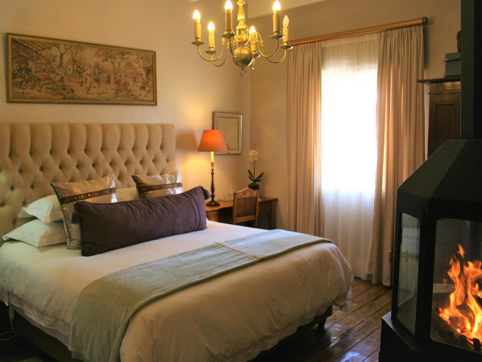 Barnett Cottage main bedroom with fireplace, wooden floors, high wooden ceiling and chandelier give the room a very romantic feel.