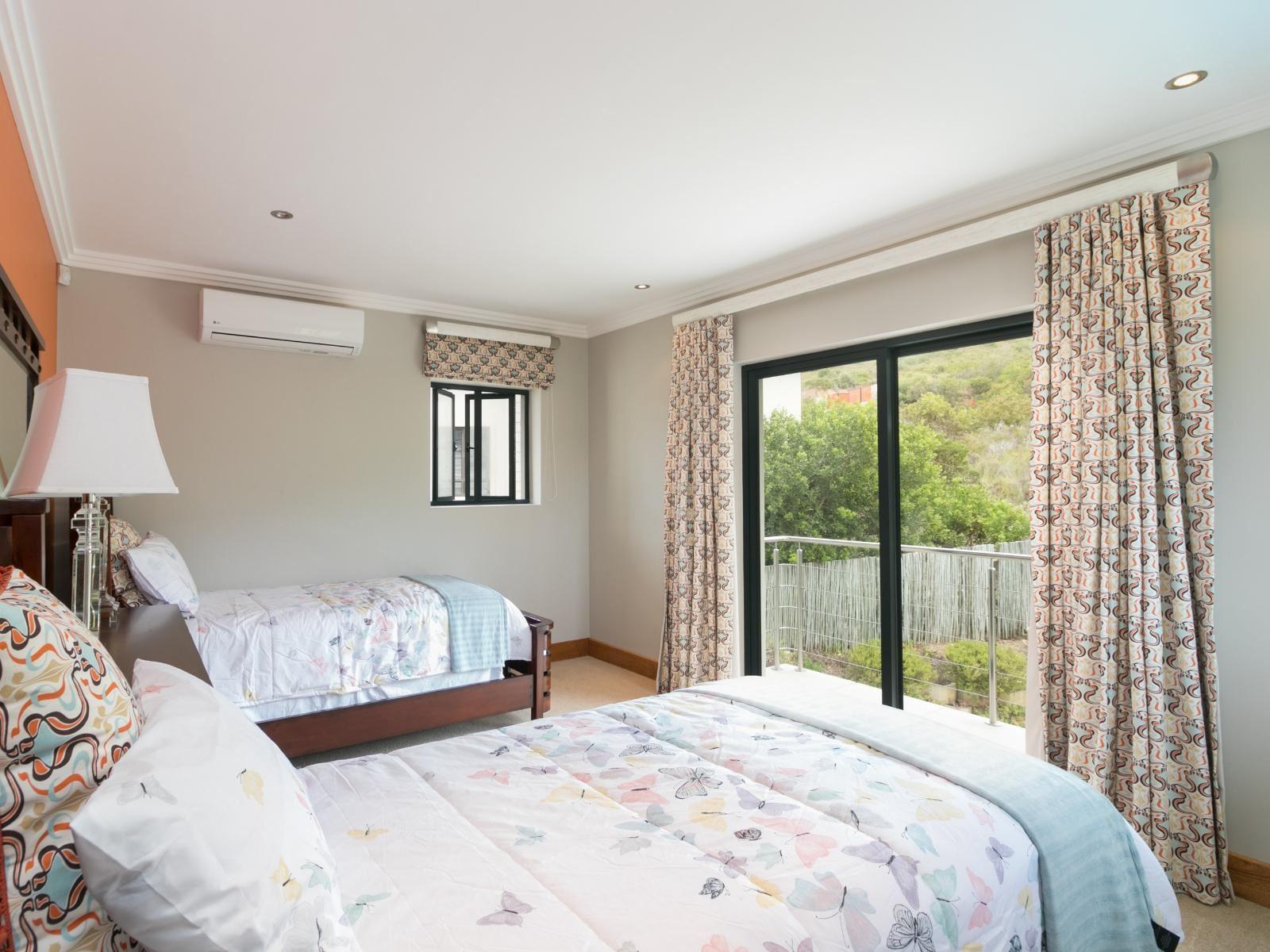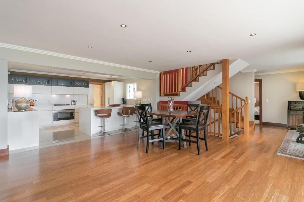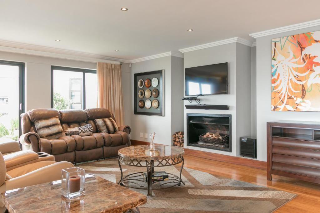 Pezula Maritime Luxury MT55 is a comfortable self-catering villa located in the prestigious Pezula Golf Estate, in Knysna. This exclusive holiday home overlooks the 14th hole of the golf course.This 400-square metre, multi-level home can accommodate up to 8 guests and comprises 4 en-suite bedrooms and 2 open-plan living areas. The main bedroom and second bedrooms each contain a queen-size bed, the second bedroom is furnished with a double bed, and the third bedroom has 2 single beds. Each bedroom features an en-suite bathroom fitted with a shower or bath or both, with a basin and a