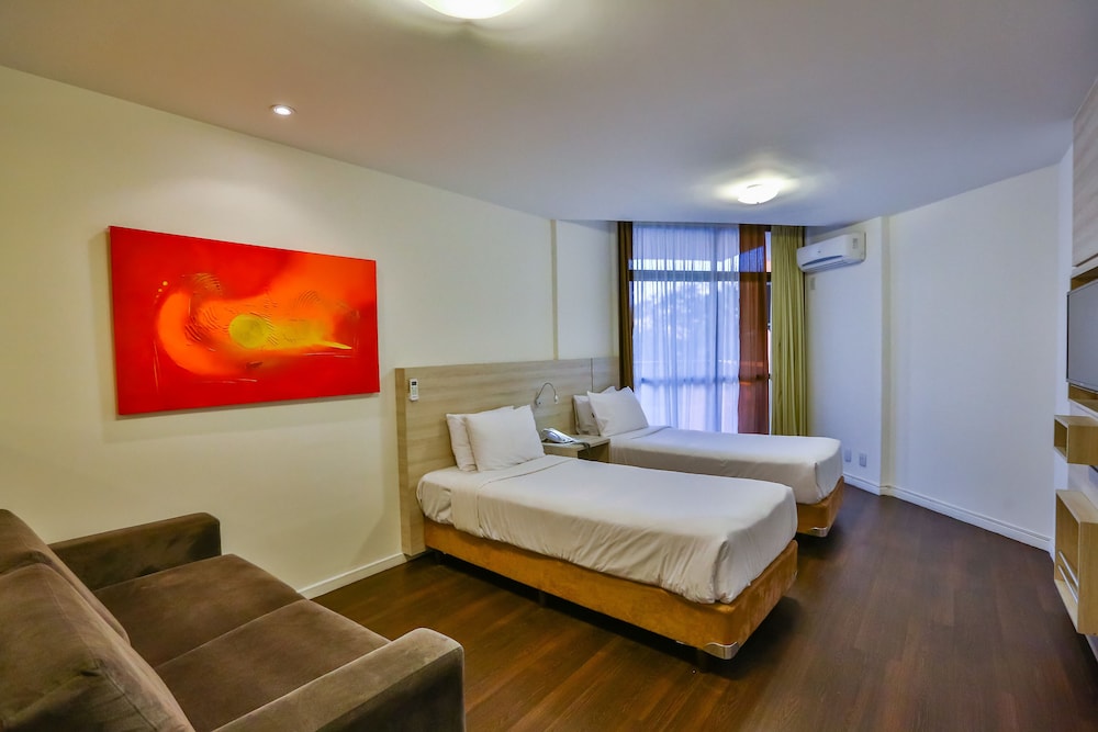 Anytime room service a year-round pool and in-room kitchenettes lead the way to the non-smoking Quality Hotel Niteroi. At the mid-rise Quality Hotel all rooms come with balconies kitchenettes sofa beds flat-panel TVs and free Wi-Fi. Breakfast is available compliments of the house seven days a week. Guests can also savor dinner in the in-house restaurant and goodies around the clock via room service. After a round of tennis or a workout in the fitness room relax achy muscles in the year-round outdoor pool hot tub and sauna. The hotel also provides a handy business center. The Quality Hotel lands guests eight miles from central Niteroi and within 20 miles of downtown Rio. The Atlantic coastline beckons less than a mile away. Driving one hour west leads to the soaring Christ the Redeemer as well as Sugarloaf Mountain. Lovers of art and culture make their way to the Niteroi Contemporary Art Museum eight miles away. The hotel is also within 23 miles of Santos Dumont and Rio de Janeiro - Galeao Internation
