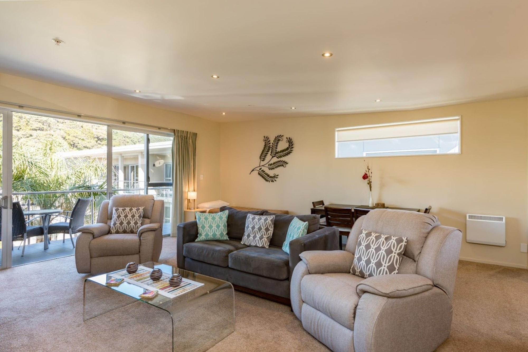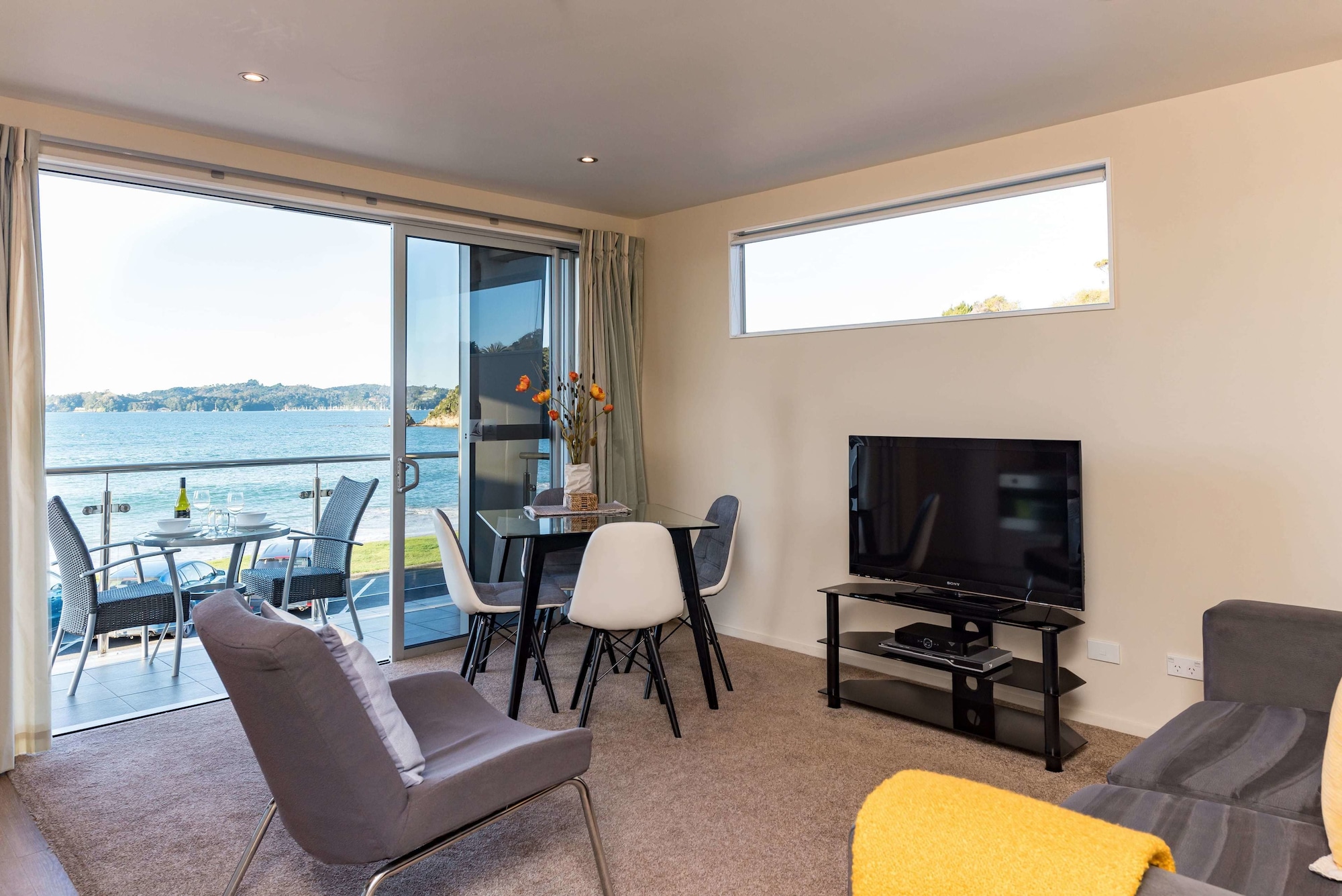 Edgewater Palms Apartments is a luxuriously modern and fully self contained 4.5 star Qualmark rated waterfront property, situated just steps away from the golden sands and beach front of Paihia, the gateway to the Bay of Islands. The 34 spacious architecturally designed one & two bedroom apartments provide unparalleled standards. Apartment highlights include expansive sea views, covered balcony, a separate lounge/living area, ultra modern kitchen & laundry facilities, Sky TV, DVD, direct dial and internet access. Each bedroom has a private en suite and modern decor throughout. Enjoy and relax around the outdoor deck area, the saltwater swimming pool and landscaped gardens. Each apartment has two secure underground car parks.