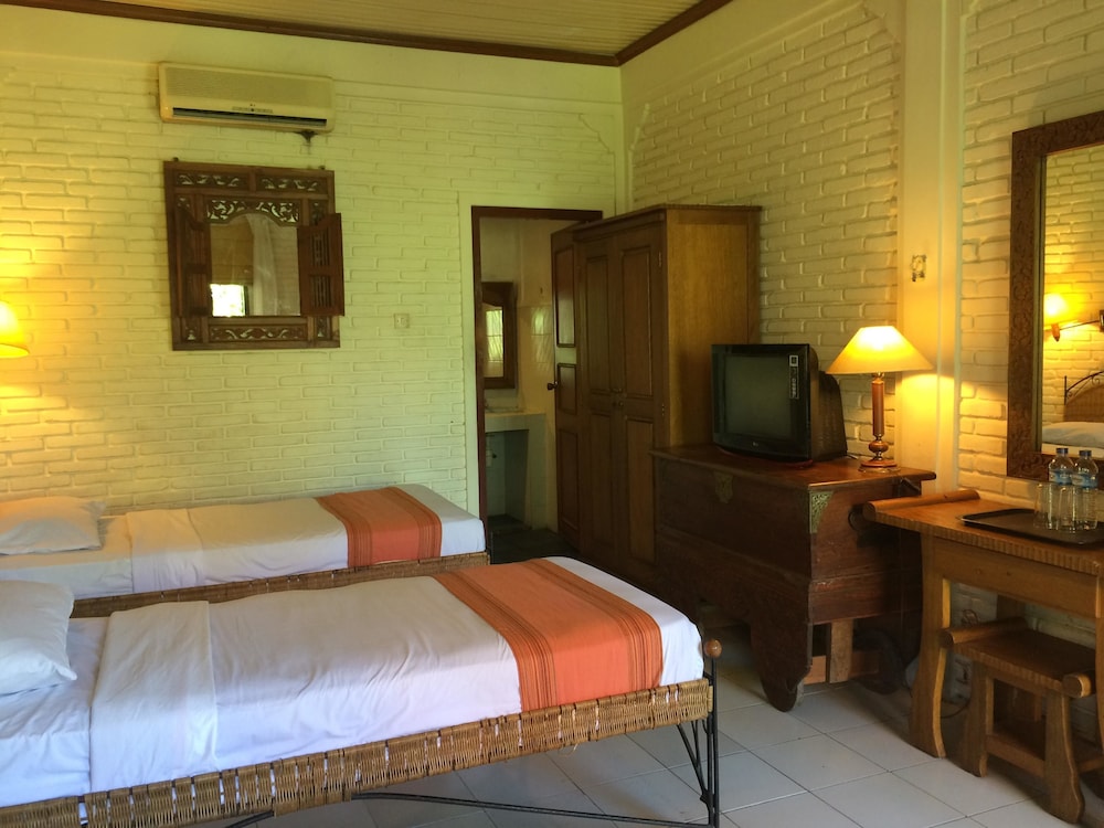 Located in Kuta, Restu Bali Hotel is in the entertainment district and minutes from Kendra Gallery and Bali Blast Monument. This hotel is within close proximity of Beachwalk and Swiss Consulate.Rooms Make yourself at home in one of the 47 air-conditioned rooms featuring refrigerators and LCD televisions. Rooms have private balconies. Complimentary wireless Internet access keeps you connected, and satellite programming is available for your entertainment. Bathrooms feature showers, complimentary toiletries, and hair dryers. Dip into one of the 2 outdoor swimming pools or enjoy other recreational amenities, which include bicycles to rent. This hotel also features complimentary wireless Internet access, concierge services, and babysitting/childcare.Dining Grab a bite to eat at the hotel's restaurant, where you can take in a garden view and dine alfresco (weather permitting). Or stay in and take advantage of 24-hour room service.Business, Other Amenities Featured amenities include dry cleaning/laundry services and a 24-hour front desk. A roundtrip airport shuttle is provided for a surcharge (available on request), and free valet parking is available onsite.