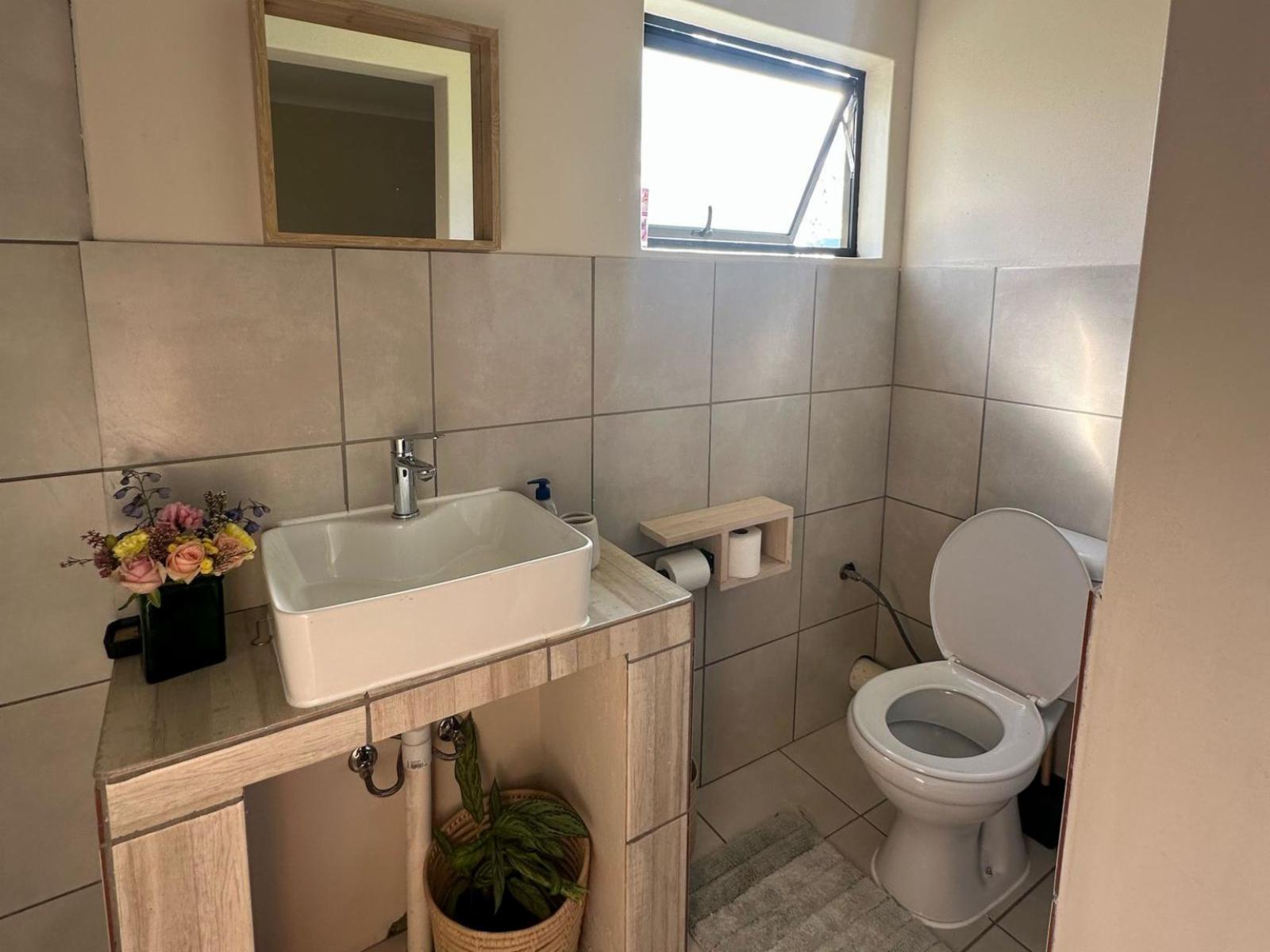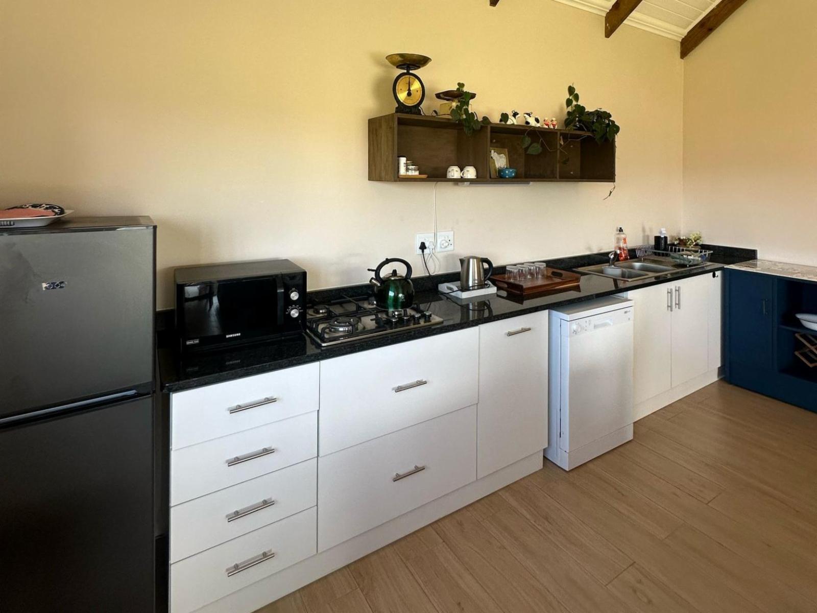 Granny Smith Cottage features two comfortable bedrooms, one with an en-suite bathroom, and a second communal bathroom for shared use. The open-plan kitchen, dining, and living area is well-equipped with a gas hob, electric oven, microwave, kettle, toaster, and a full set of cutlery and crockery. A dishwasher and washing machine add to the convenience, while a wood-burning iron stove keeps the space cosy during cooler weather. Outside, a large patio with a built-in braai provides the perfect setting for relaxed outdoor dining and enjoying the peaceful surroundings.
