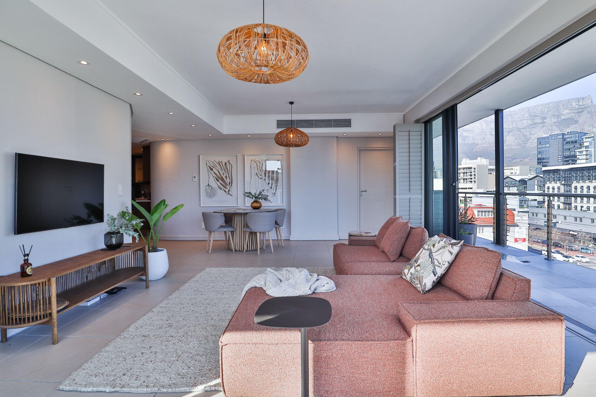 This luxurious and spacious 2-bedroom apartment offers stunning panoramic views. It features 2 bathrooms, a pool, a gym, and on-site restaurants. The fully equipped kitchen includes all necessary amenities, and uncapped Wi-Fi is available throughout the apartment. A smart TV is provided for your entertainment, and bed linen and towels are included for your convenience. Additionally, there is dedicated parking within the building.The Rockwell Building in De Waterkant offers a luxurious 2-bedroom apartment with stunning views. This apartment features spacious rooms, modern amenities,