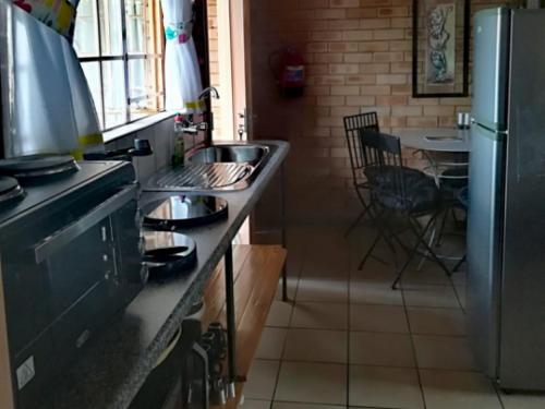 *Anki, June, and Santa kitchens: Equipped with stove with an oven, microwave, fridge with freezer, cooking pots, kettle, and toaster, outside braai facility, cooking and eating utensils
