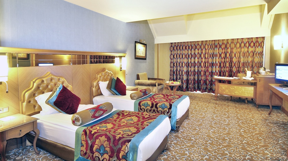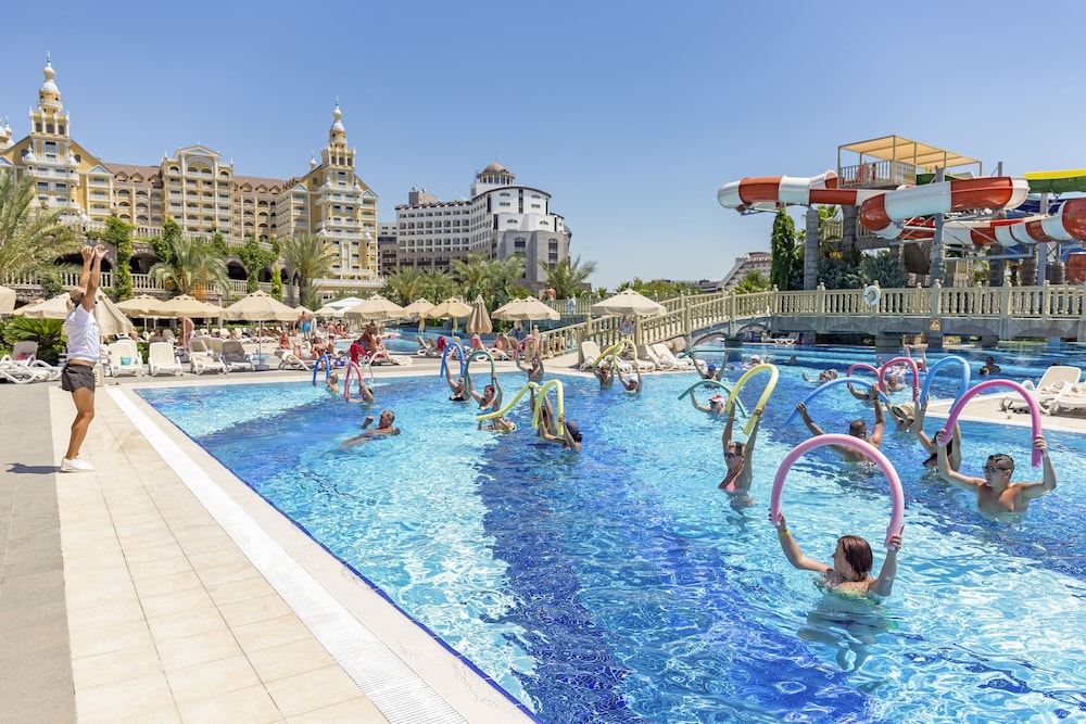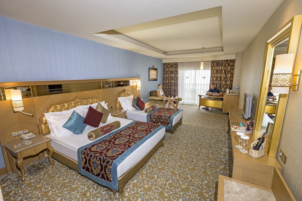 The hotel is located in the popular Lara Beach area on the outskirts of Antalya. It is situated right on the beach with public transport available nearby. Antalya Airport is approximately 16 kilometres from the hotel. The hotel occupies 53,000m2 of coastline and offers a range of facilities and amenities to suit most tastes. It offers a choice of bars as well as the main restaurant; there are a number of a la carte restaurants, an amphitheatre and disco. Indoors, there is a spa and wellness centre, a number of shops as well as an internet café and games room.