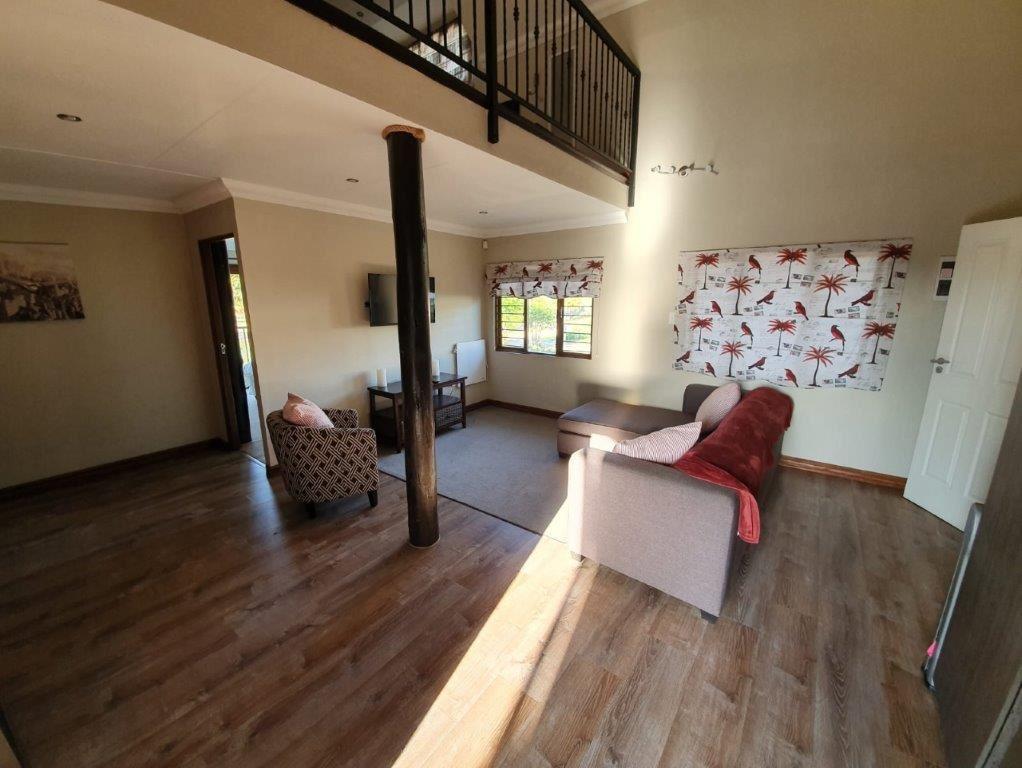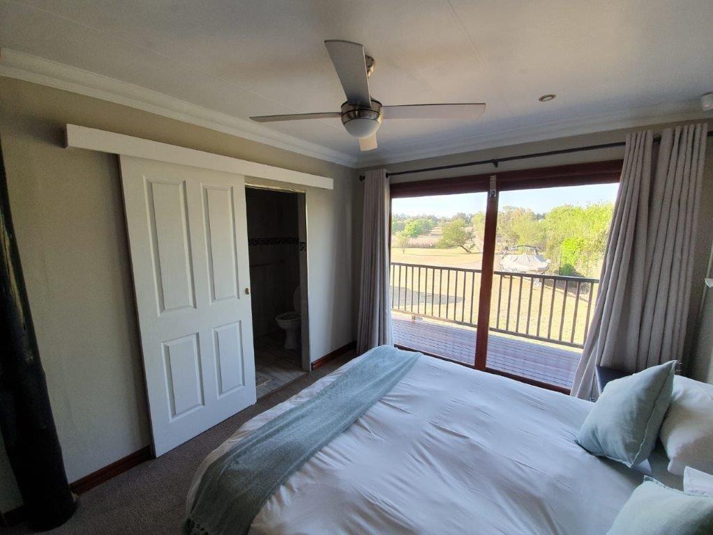 Sacred Ibis is a beautiful riverfront self-catering house situated right on the banks of the Vaal River, just outside Sasolburg. This secure thatch lodge can accommodate up to 16 guests comfortably.The house consists of four double bedrooms, five bathrooms of which three are en-suite, a loft area with four single beds, a kids loft room with four single beds and a camp cot, a fully equipped kitchen with a dishwasher, and two lounge areas. Bring your own decoder and smart card for DStv access. There is a washing machine available on the ground floor.There is a sunny pa