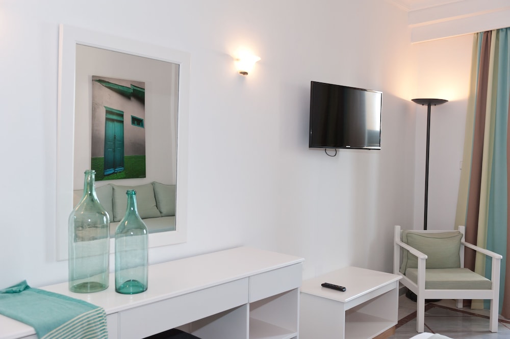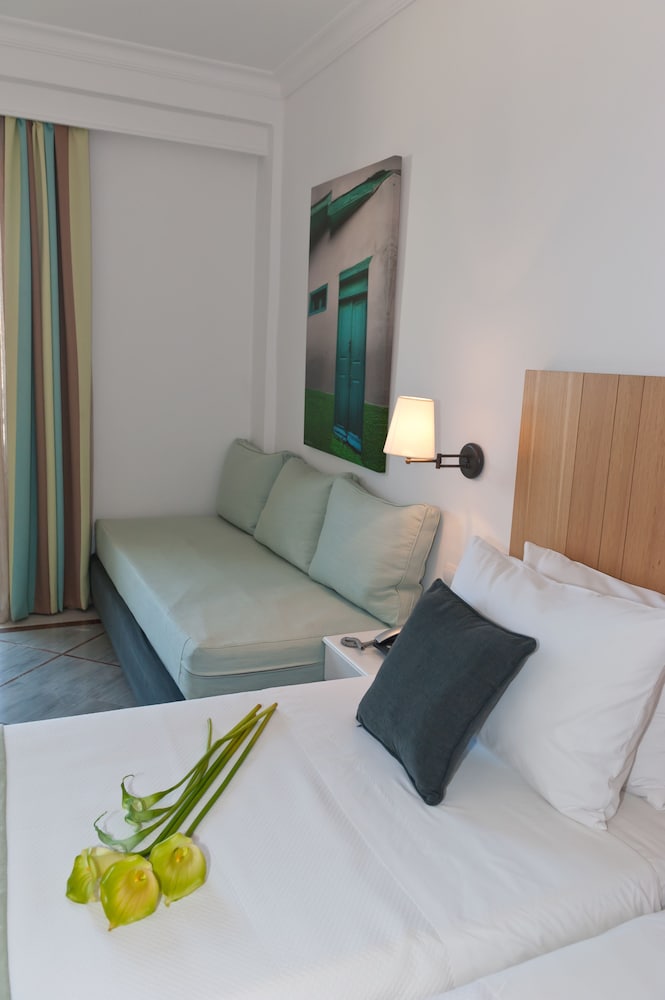 This wonderful hotel is located merely 100 m from the pebbly beach and 1km from the town of Karlovassi. This facility is an ideal place for a relaxing holiday or a base for exploring the beautiful island of Samos with its mountains, rich vegetation and lovely beaches. Facilities on offer include a swimming pool and children's pool. Sports enthusiast may choose from variety of sports such as tennis court, fitness room and table tennis. Conference facilities, reception and lobby area and a TV room are also available. Furthermore a shopping area and parking are also to be found in the vicinity. This A category hotel has 300 beds in 130 comfortable, air-conditioned and tastefully furnished rooms. Each room has a private bathroom, terrace or balcony and is well-equipped as standard with fridge, hairdryer, 32" Flat screen TV and phone.