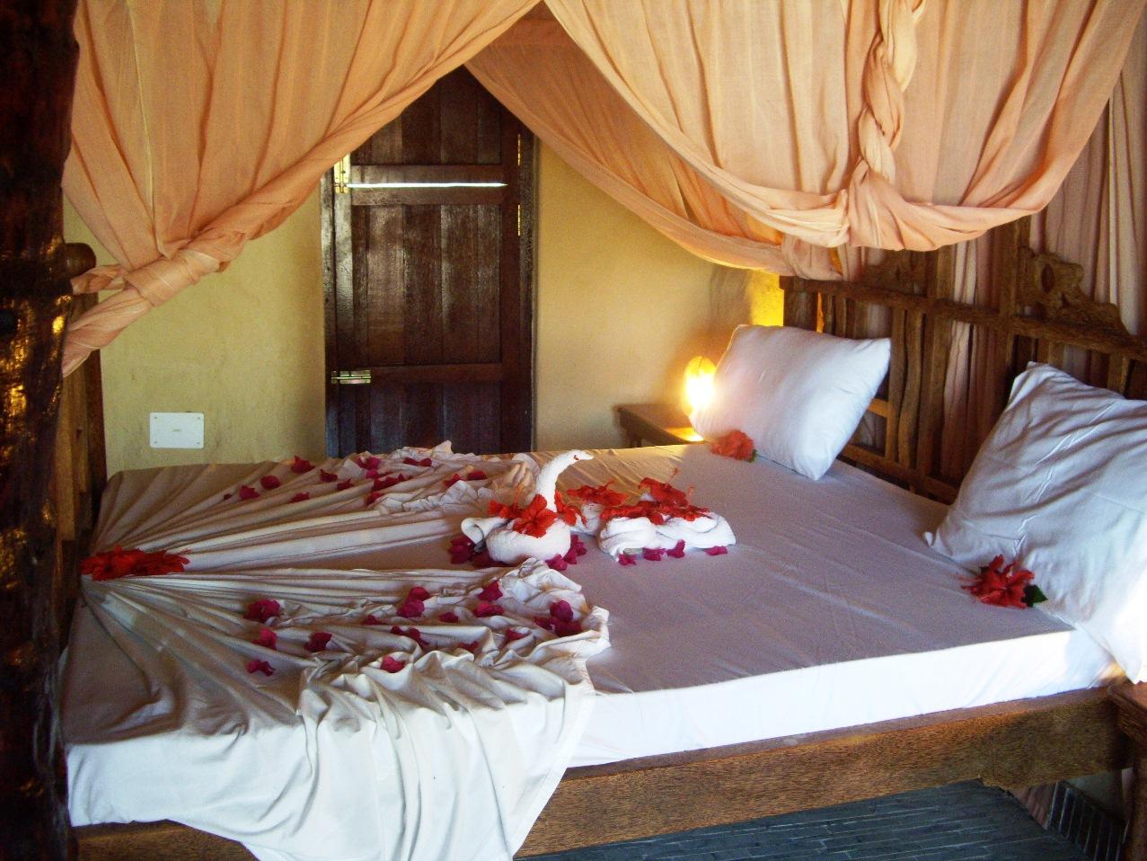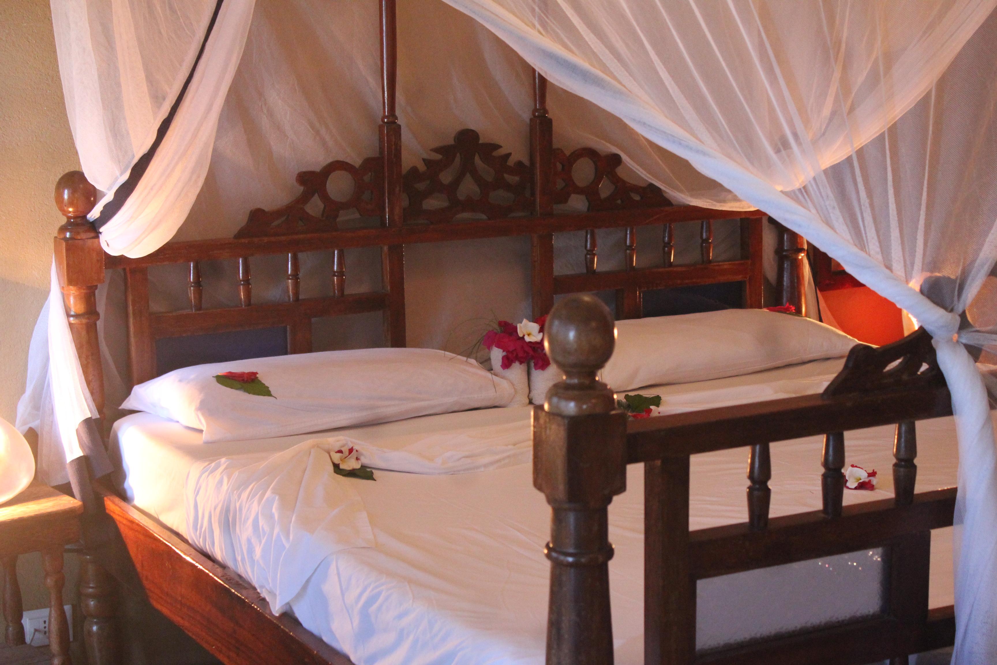 The rooms are fitted with a selection of traditional furniture, including sumptuous Swahili beds draped with gauzy netting and adorned daily with fresh-cut exotic flowers. Every room also contains the necessary comforts of an en-suite bathroom, ceiling fan, air-conditioning, hairdryer, and safe. Six Deluxe Rooms also include a television and refrigerator. In addition, the hotel contains facilities such as a boutique, a spa and medical service, and also offers Wi-Fi Internet.