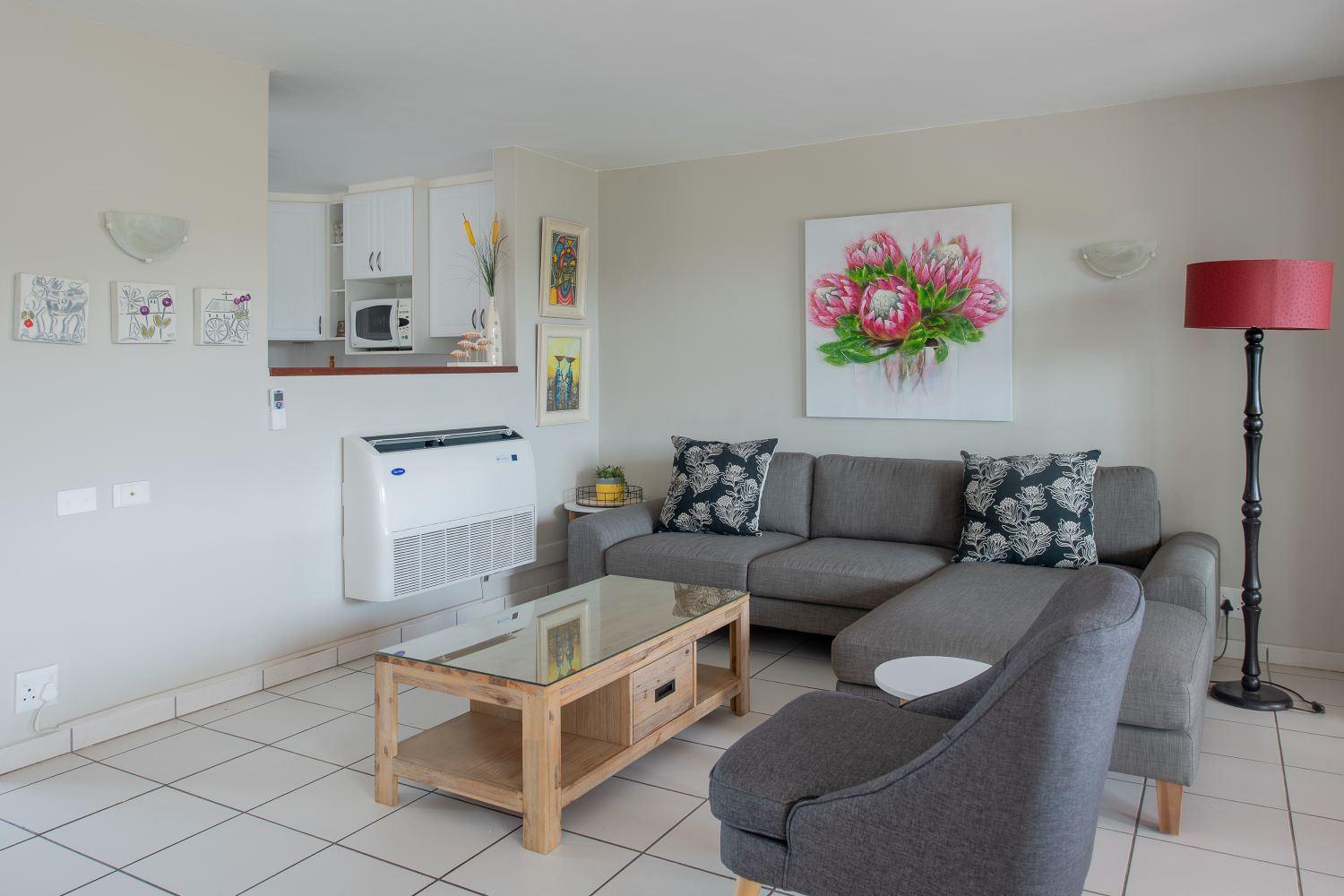 This Villa is an inviting three-bedroom, two-bathroom with an unique view that's overlooking the estate and the beauty of the nature. It is centrally located to the beach, the Mashie course and the bowling alley. It is especially convenient because it is fully equipped with all the necessary equipment that can make your holiday unforgettable. It's lounge, diner with kitchen areas are open plan. A sliding door leads from the lounge area to a patio where you can socialize together. A TV and DSTV has an on/off decoder facility which makes is much more convenient for it's guests. The master