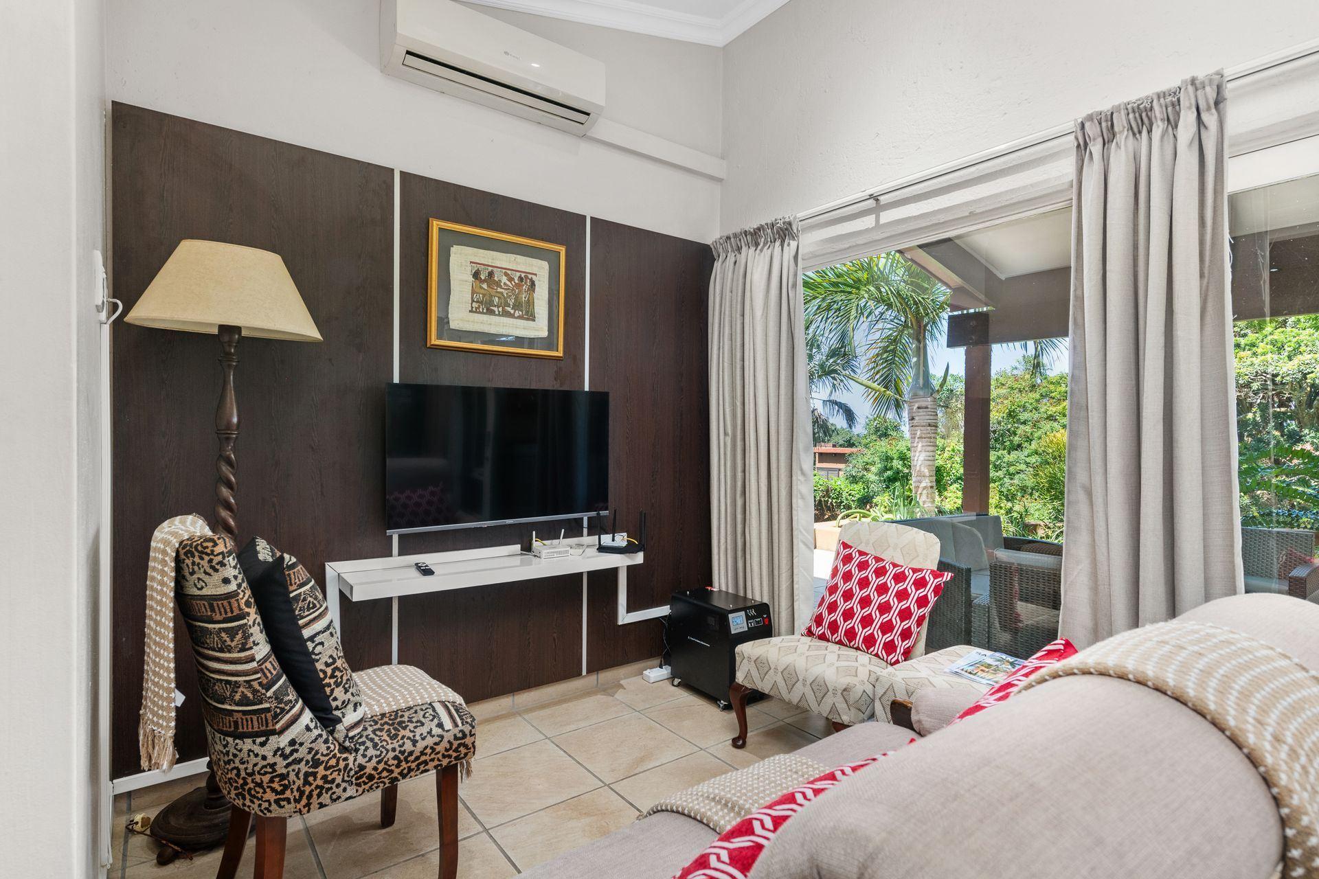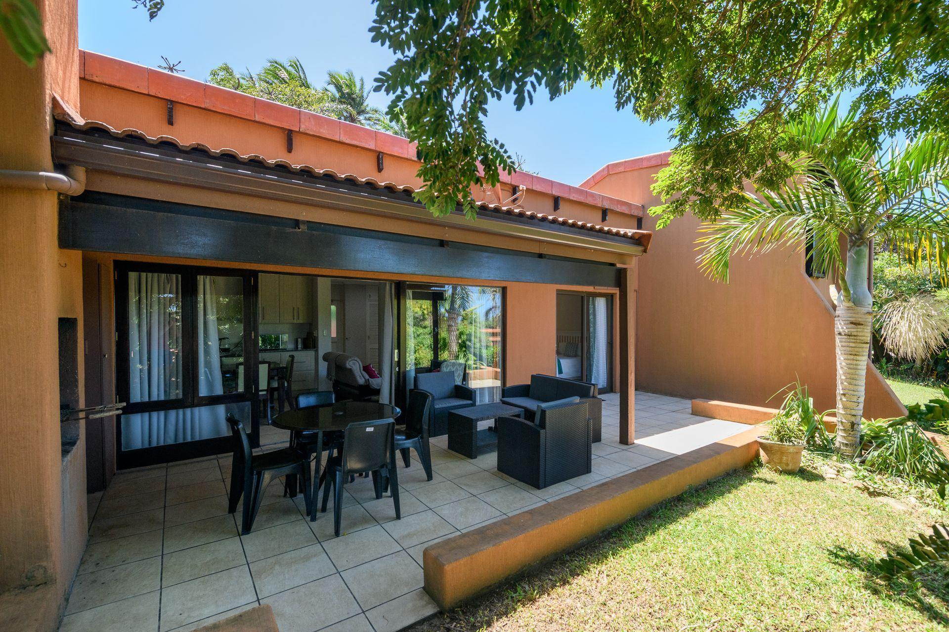 The bedroom is equipped with air conditioning and a private bathroom with a shower, ensuring a relaxing and enjoyable stay. The open-plan living area, complete with a kitchen, dining space, and lounge, extends to a patio and garden, offering access to a large grassy area with seating and braai facilities.