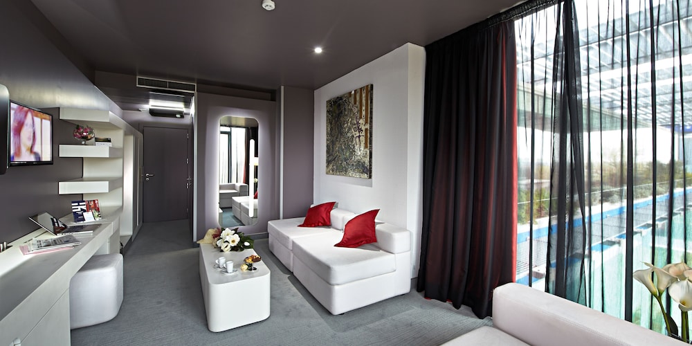 San Ranieri Hotel in Pisa is ideal for an elegant and serene stay whether for a business meeting, a short stay or an extended holiday. A marvelous glass system surrounds the entire four-story building with beautiful ever-changing hues beginning at sunset, offering you a stay filled with comfort and tranquility in a sea of light and color. The environment, distinguished by its warmth and color, includes hanging gardens and climbing plants, space for meetings and congresses equipped with sophisticated technology in an elegant and modern setting, as well as provides for fine dining at Squisitia Restaurant.San Ranieri Hotel is located in the new zone of Pisa. It is a few minutes away from the Leaning Tower and Piazza dei Miracoli (Field of Miracles), from the University and the historic center, and from Cisanello Hospital. The Railway Station and the Airport are easily accessed due to their strategic location, and in very close proximity are the motorway onramps for your continued journey into the rest of Tuscany, including the nearby sea, surrounding hills and other art-filled cities.A new and unique idea for Pisa. San Ranieri Hotel offers you a stay at the forefront of architectural solutions which respect nature and the environment. It is an elegant and modern place with an element of playfulness. Also, its modernity is not limited to appearance but permeates its contents, in terms of advanced and innovative technology.A marvelous glass system surrounds the entire four-story building. This innovative and aesthetic ecological glass system makes for optimal temperature regulation at all times, as well as creates an internal oasis of silence and comfort. Consciously conceived to save energy, the glass system