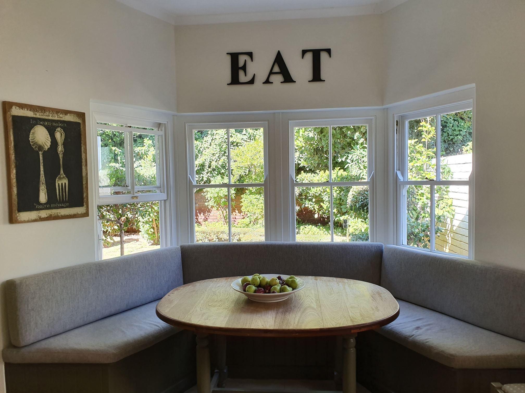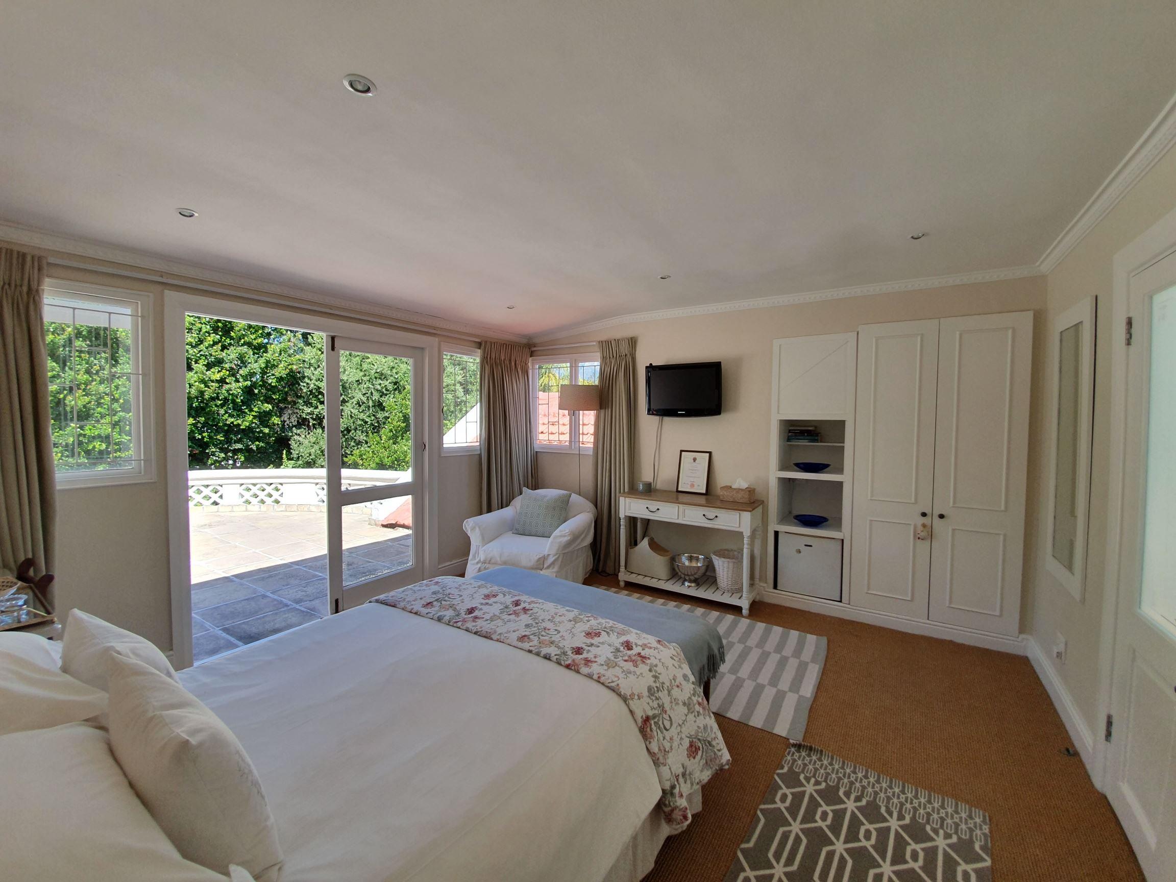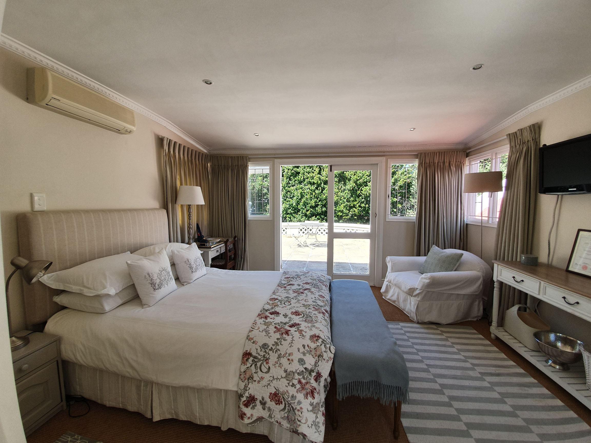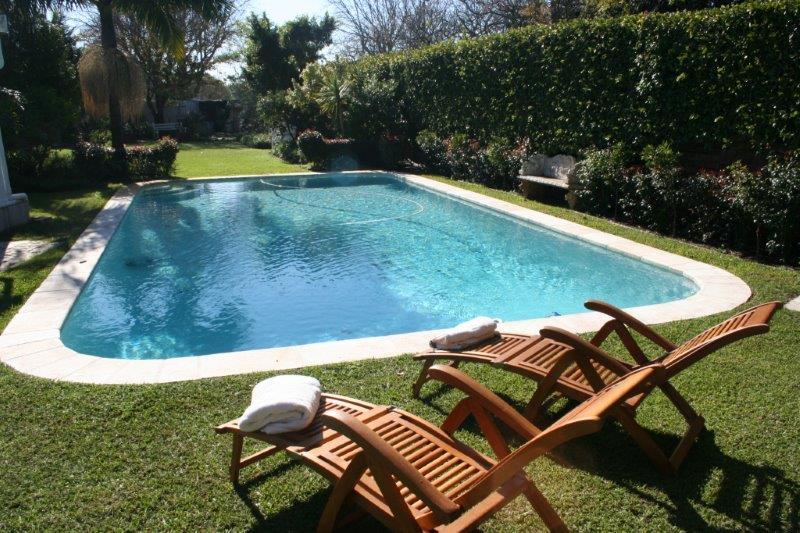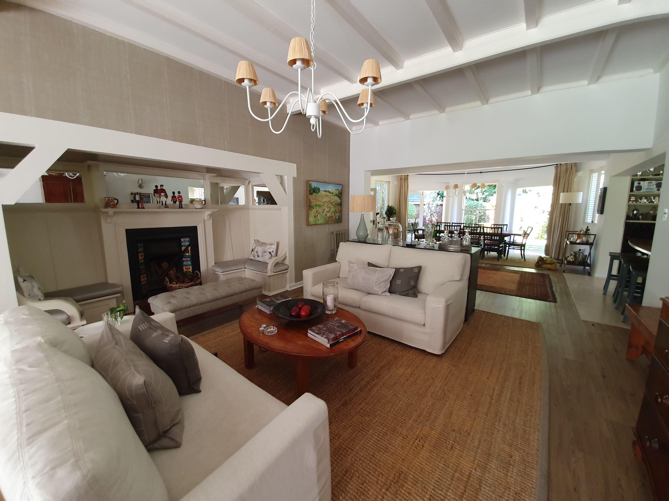 Sandown House is well located in the leafy residential suburb of Rondebosch in Cape Town, South Africa.This house sleeps up to ten guests in five en-suite bedrooms. Two spacious lounge areas and a dining room which are very tastefully furnished open off a large "eat-in" kitchen. The flow through large French doors onto a sheltered veranda which houses a full lounge, dining area and fireplace allows for easy el-fresco living.The large swimming pool is set in a magnificent landscaped garden.Off street parking behind automated security gates. The
