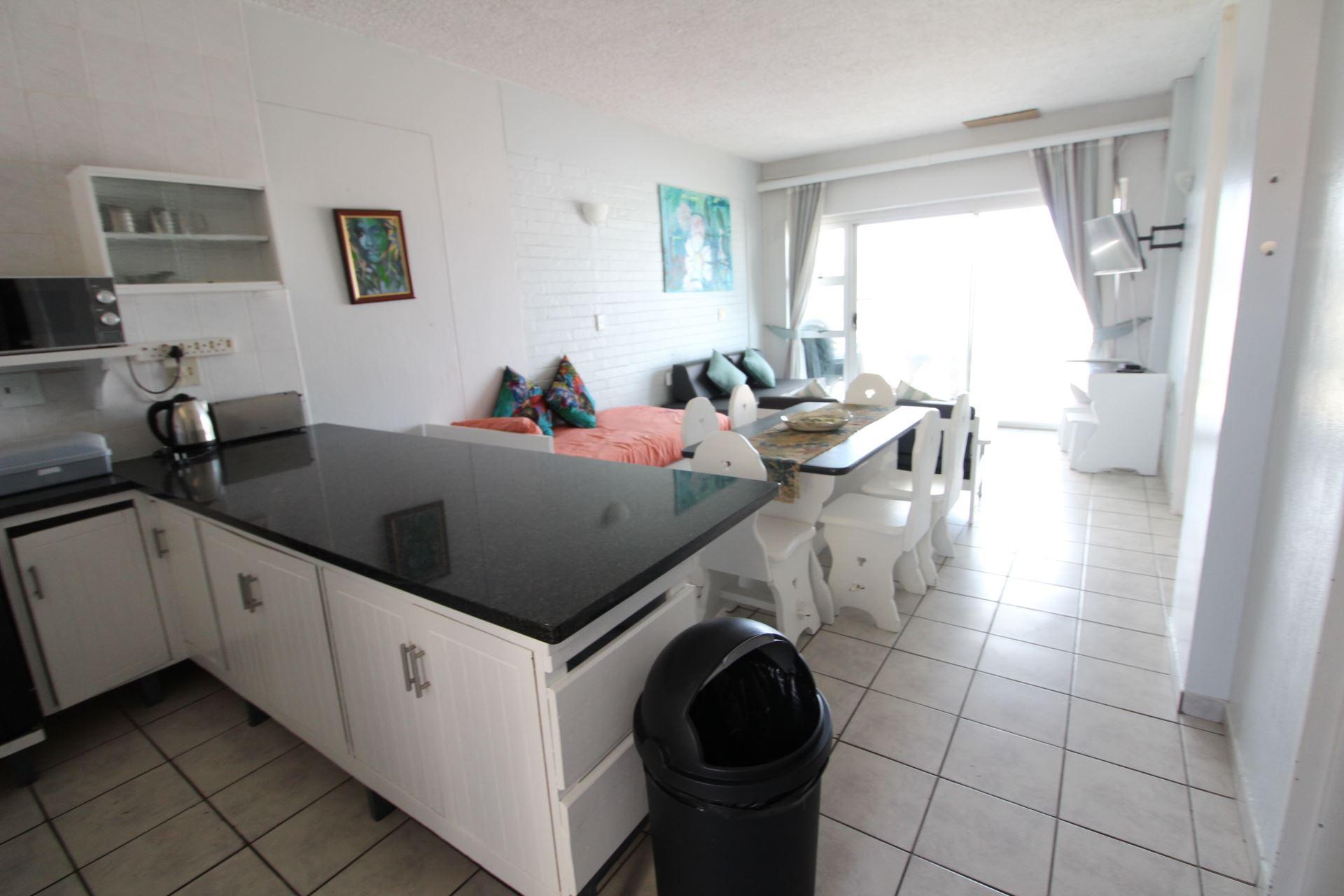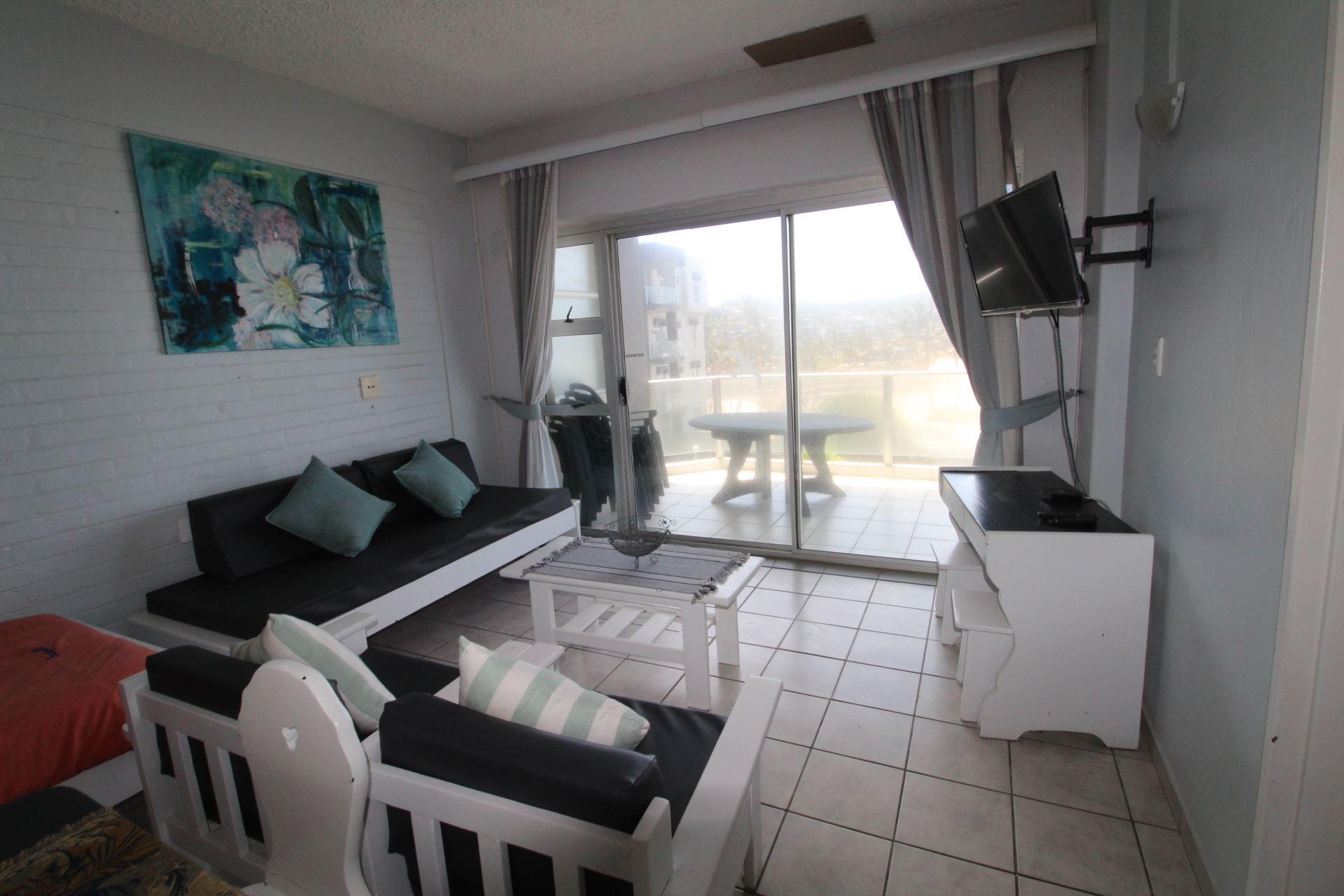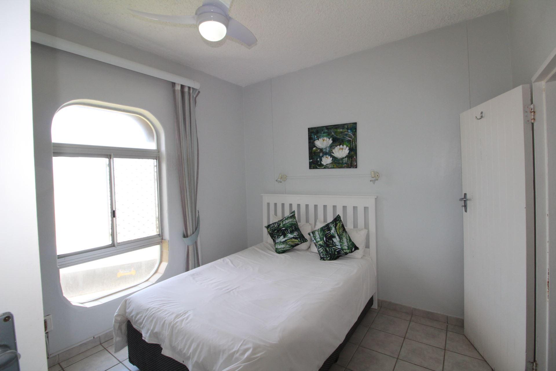 Seagull 405 is a self-catering holiday apartment in Margate.The unit is furnished with rustic furniture and a beach-type of style, family-orientated. The main bedroom is furnished with a double bed and the second bedroom is furnished with two single bed, the 5th bed is in the lounge area. Linen is supplied. The first bathroom is fitted with a bath, toilet, and basin. The second bathroom is fitted with a corner shower, toilet, and basin. Please bring your own towels and toiletries. The kitchen is equipped with a fridge, microwave, toaster, and kettle plus utensils. There is a