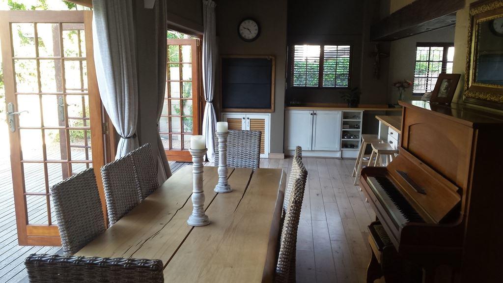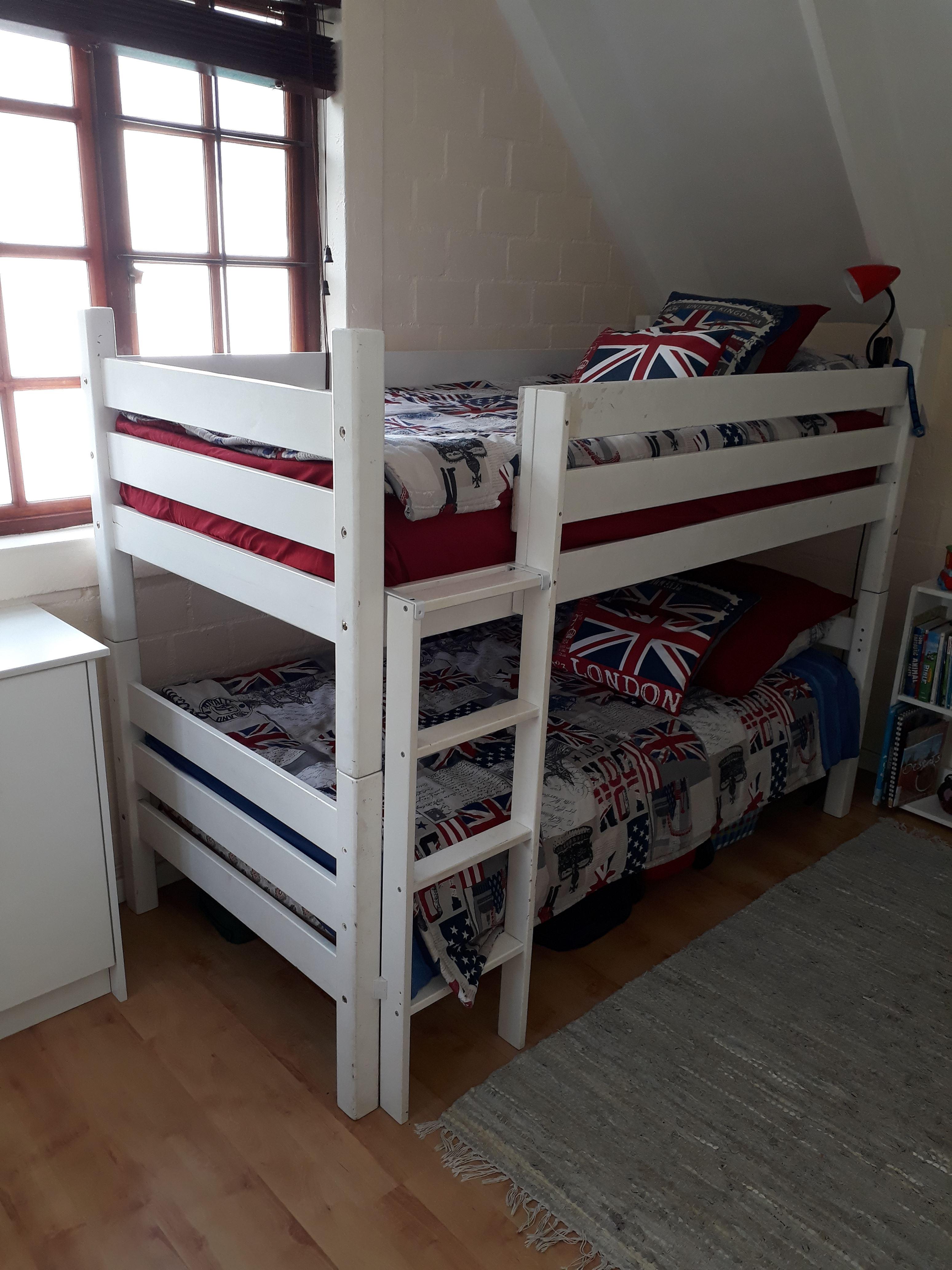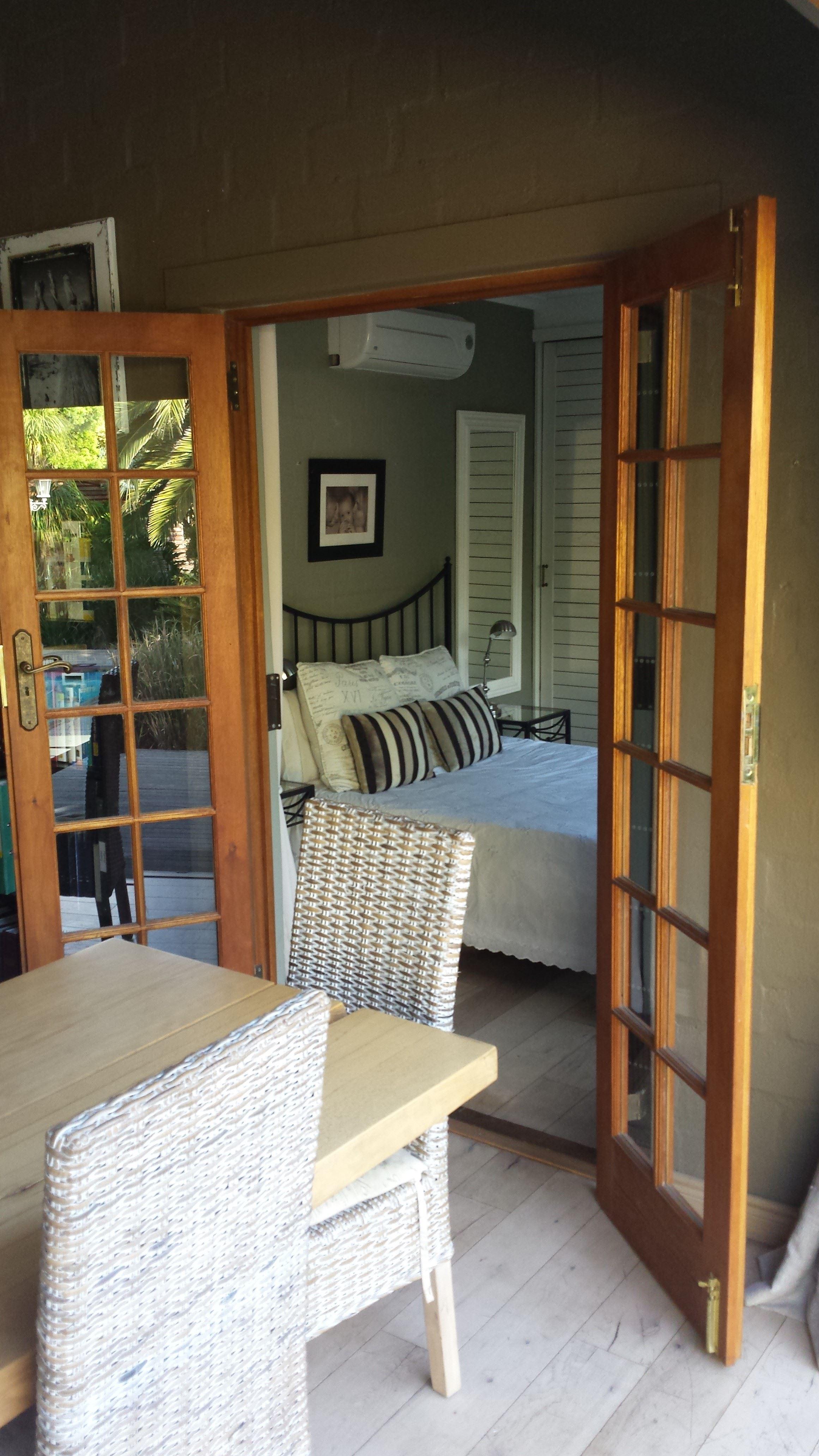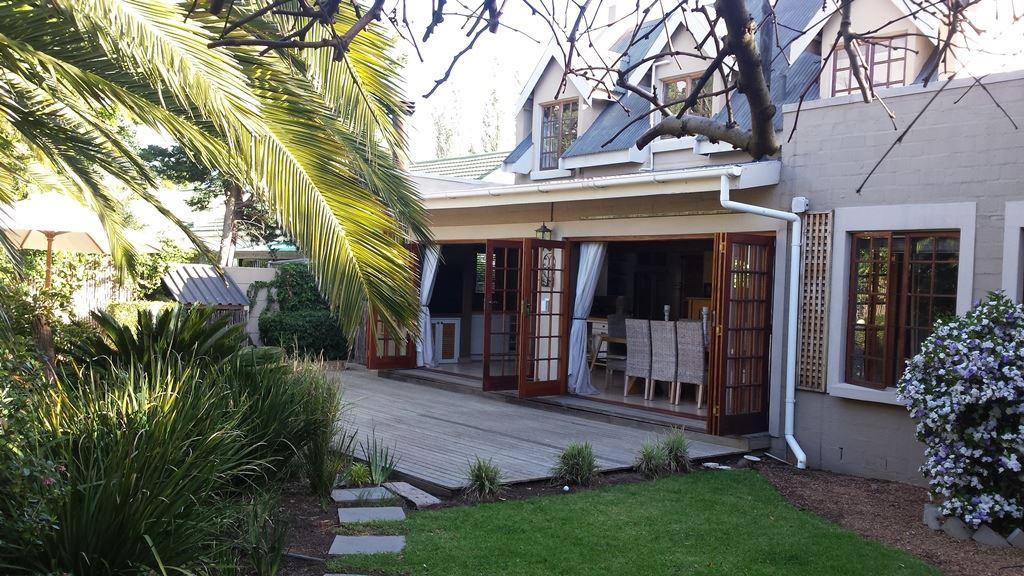 Charming and sunny house with pool in Somerset West, Cape Town, for holiday rental.Beautiful cottage style house with stunning wooden floors situated in a quiet lane in Somerset West. Lounge with wood burner, flat screen TV, dining room and open-plan breakfast are all a part of this home. There is a braai area opening onto a wooden deck with a pool via wooden stack doors. Light and bright kitchen with oven and gas hob. Three bedrooms with air-conditioning. Two are upstairs, one with a double bed and the other with a bunk bed, sharing a bathroom with shower and oval bath. Downstair