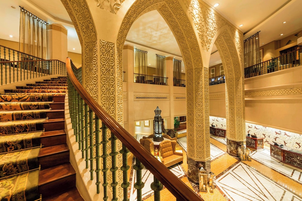 Deluxe Class Modern Hotel. (exterior) The hotel exterior is a light sandstone colour and has an interesting design resembling a large sand castle. (lobby) The very large lobby has beige marble flooring, with a white ceiling and attractive glass lights. Plants are dotted around the lobby, giving the area a fresh feeling. (general) Cross the Al Mussafah Bridge-Arabian Gulf Road to Corniche. Turn right on Corniche and continue 5 kilometers.