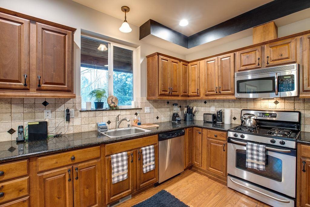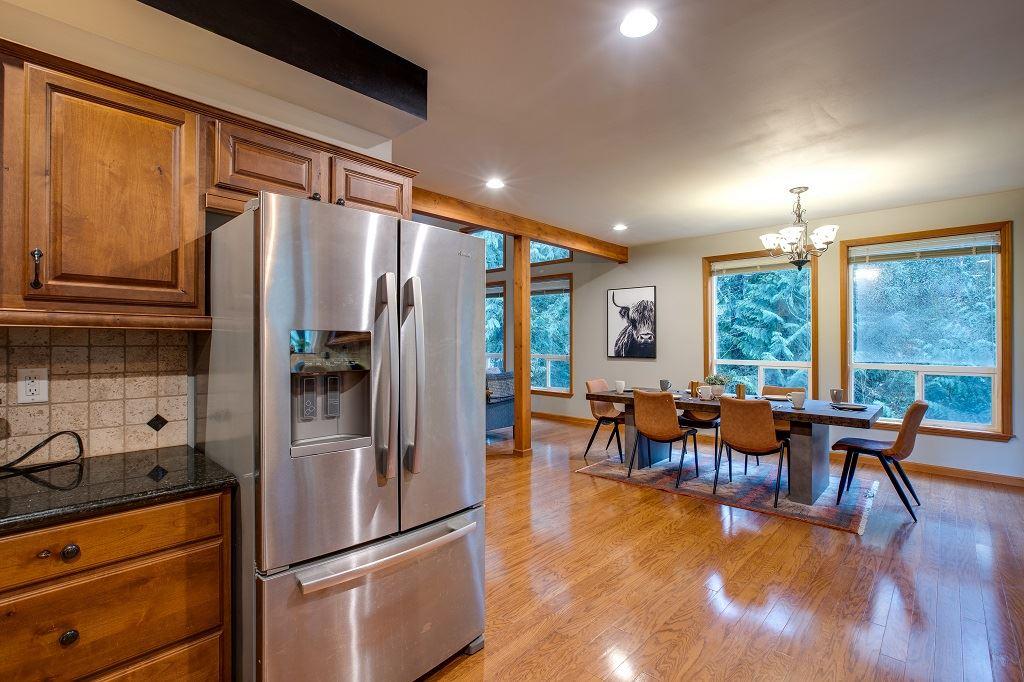 You and your family will have a delightful time making lasting memories in this two storey, three bedroom 2.5-bath Mt. Baker country home! The first floor features an open and airy living room with vaulted ceilings, a corner group sofa, and a 60” flat screen monitor, accentuated by a field stone encased gas fireplace. There’s also a fully equipped kitchen with beautiful cabinetry and countertops, as well as higher-end appliances, including a dishwasher. The dining area features a large dining table with generous seating. French doors lead to a full-length covered deck…perfect for enjoying