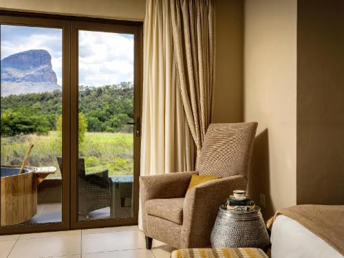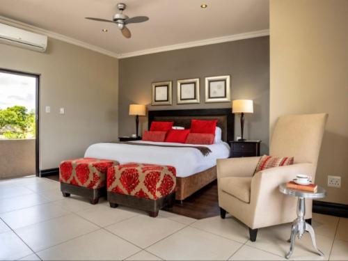 Unwind in your own private sanctuary, where large stacking doors open up to reveal a mesmerizing view of the surrounding flora and fauna. Watch in awe as graceful herds of buck, zebra, sable, and guinea fowl wander by, creating an enchanting spectacle right before your eyes. Inside, find solace in the spacious, air-conditioned suite featuring a plush king-size bed and a luxurious en-suite bathroom with a separate bath and shower. Tastefully appointed with every amenity, including linen, extra blankets, a tea and coffee station, bar fridge, ceiling fan, and more, each suite leaves no desire unfulfilled. Connect to the world with free Wi-Fi, indulge in some Netflix entertainment on the wall-mounted TV, and feel secure knowing that an electronic safe is available for your valuables. A hairdryer, emergency light, and mosquito spray ensure that your comfort is always prioritized.