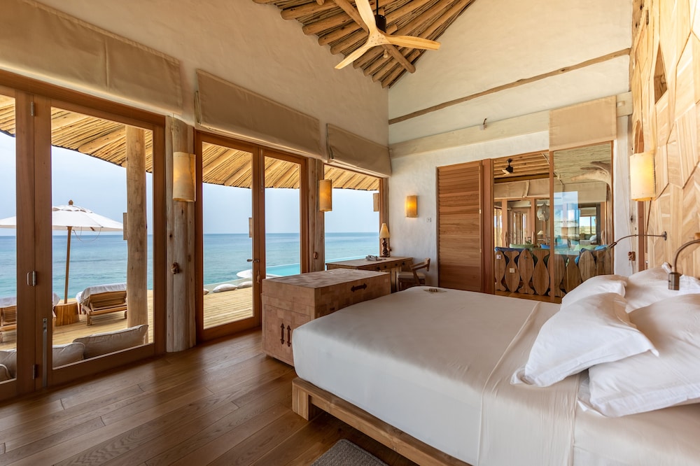 Spacious luxury villas at Soneva Fushi are hidden among dense foliage on a private island located within the Baa Atoll a UNESCO Biosphere Reserve. It is a 30-minute seaplane transfer from Male International Airport.At this eco friendly resort all the villas and rooms are extraordinarily spacious and enjoy direct private access to the beach. Signature bathrooms are built within a large private garden setting with outdoor showers and separate bathtubs.You can explore the island with complimentary bicycles. Intuitive service is provided by Mr./Ms. Friday butlers. Highlights include the open-air Cinema Paradiso counting Saturn’s rings in the high-tech Observatory the home-made chocolate and ice cream rooms five hundred wines to choose from and six different restaurants.Learn the art of glass blowing at the Maldives’ only glass studio discover the waters with complimentary non-motorised water sports and sail aboard Soneva’s luxury two-bedroom yacht Soneva in Aqua.Guests can spend an evening overnight at the Sandbank completely private and remote for a truly intimate experience under the stars.