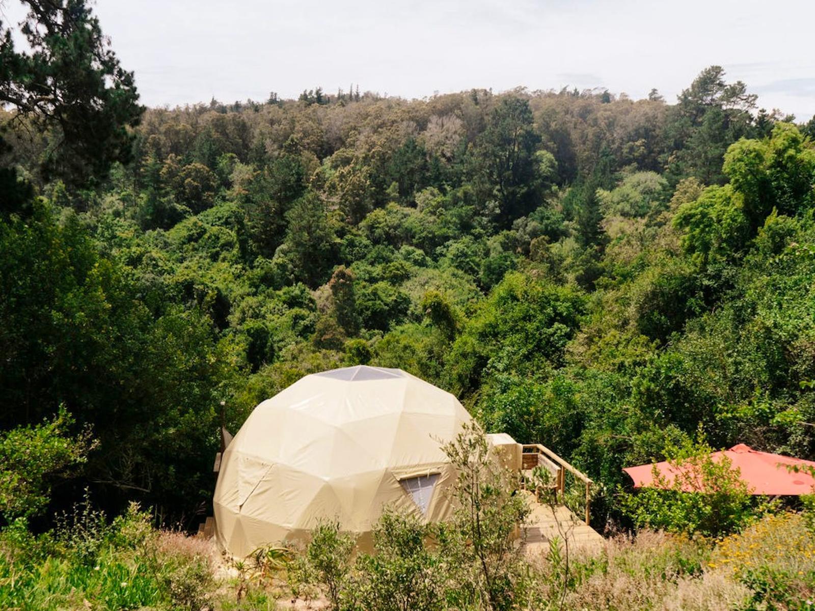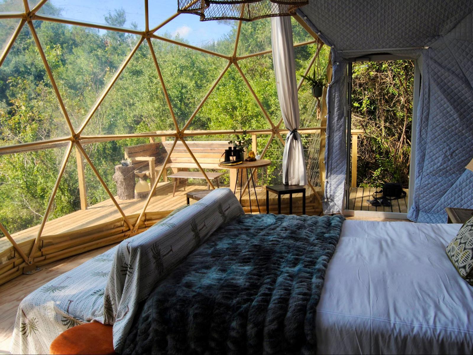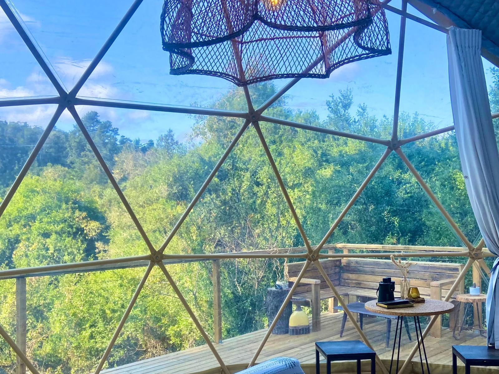 Soul Forest Stay's offers the secluded off-the-grid Soul Forest GeoDome offers a secluded, off-the-grid retreat set within a communal farm in the tranquil countryside of Knysna. Nestled on a deck surrounded by lush indigenous forest, the dome provides breathtaking views over the valley, making it an ideal escape for those seeking peace and natural beauty.Inside, the GeoDome is thoughtfully divided into three distinct areas. The front features a cosy queen-sized bed, positioned to face a large half-circle window, creating a peaceful space to unwind and enjoy the view. A comfortable