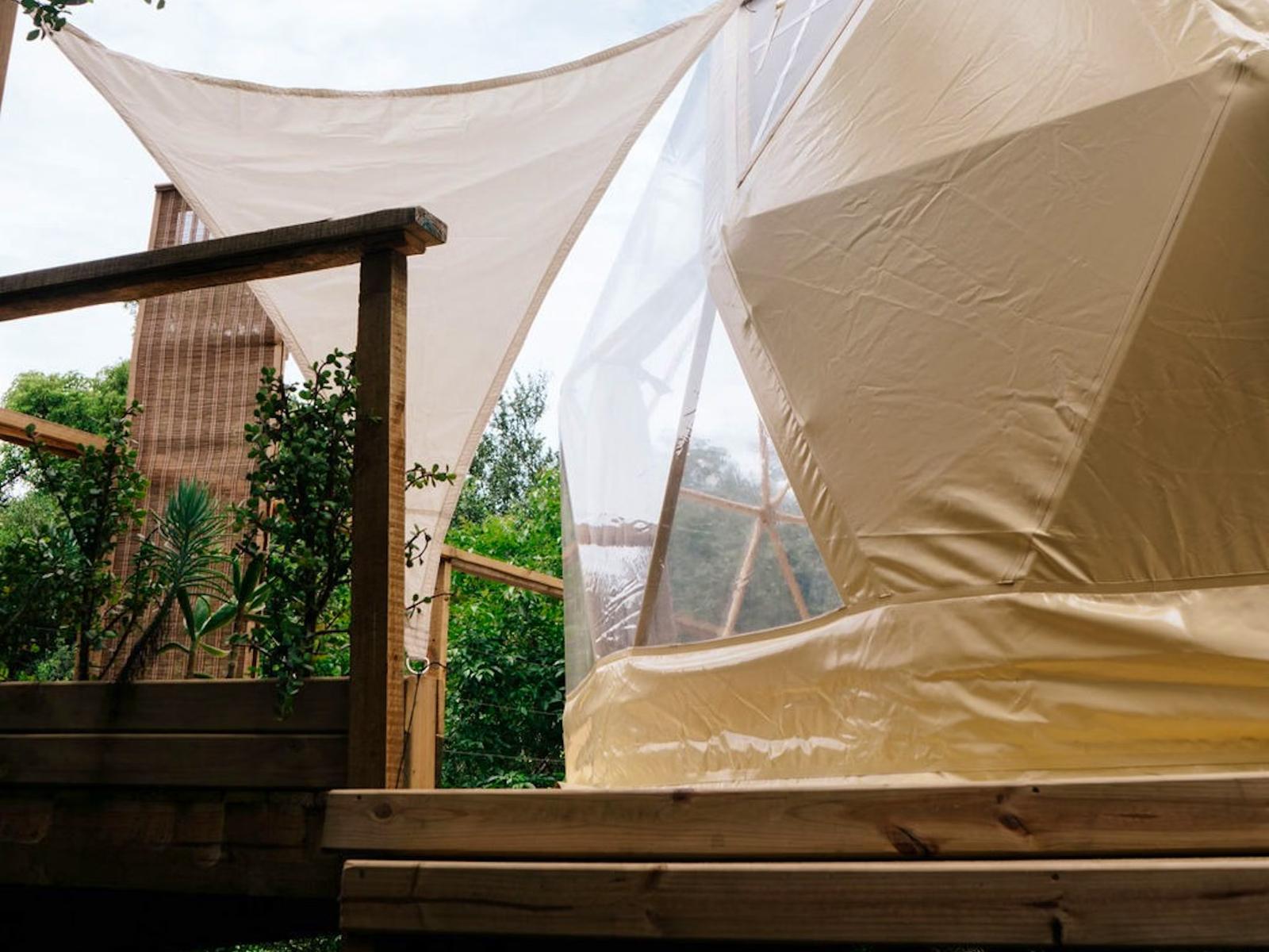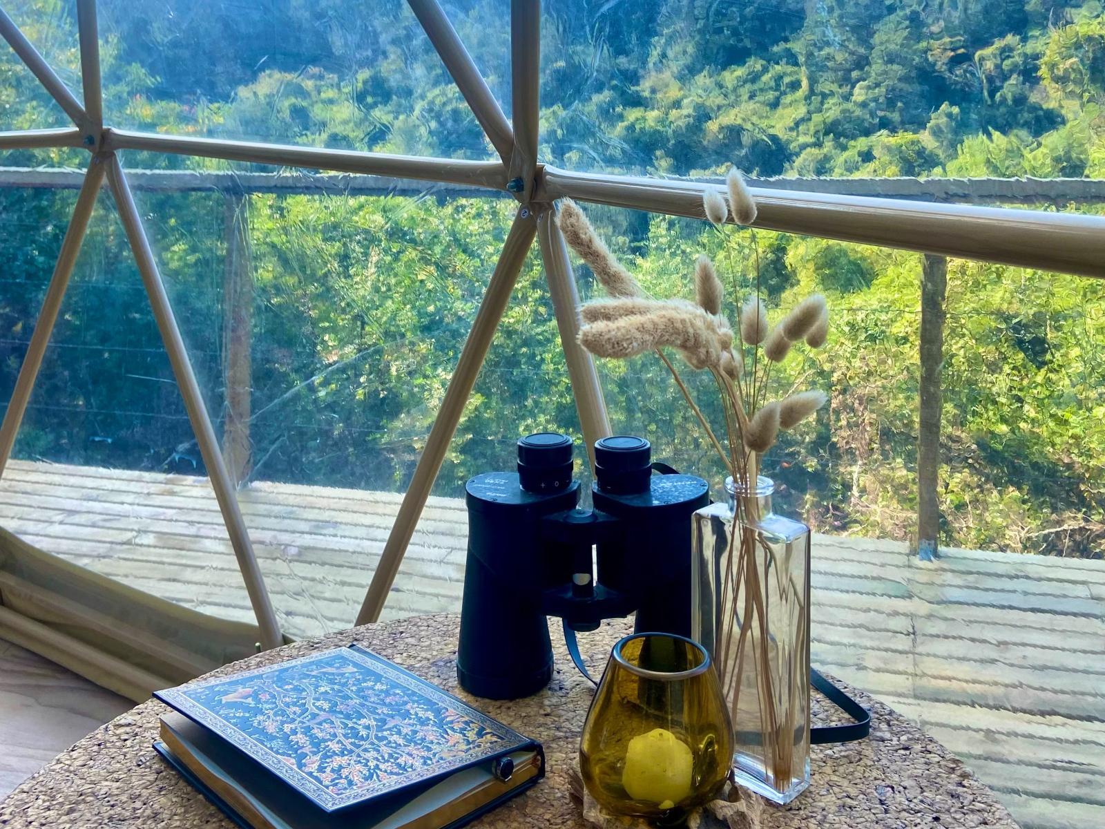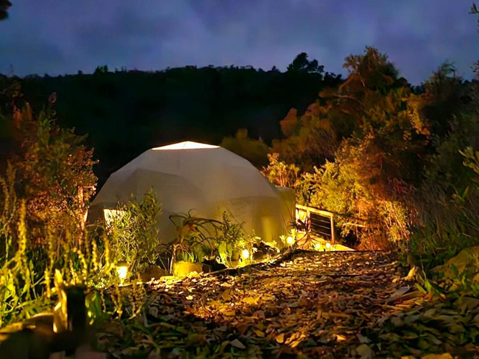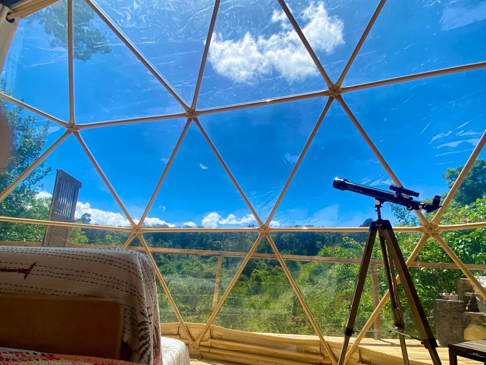 Soul Forest Stay's offers the secluded off-the-grid Soul Forest GeoDome offers a secluded, off-the-grid retreat set within a communal farm in the tranquil countryside of Knysna. Nestled on a deck surrounded by lush indigenous forest, the dome provides breathtaking views over the valley, making it an ideal escape for those seeking peace and natural beauty.Inside, the GeoDome is thoughtfully divided into three distinct areas. The front features a cosy queen-sized bed, positioned to face a large half-circle window, creating a peaceful space to unwind and enjoy the view. A comfortable