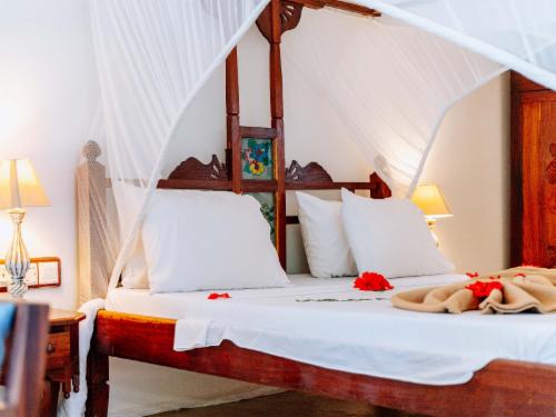 Enjoy your vacation in typical Zanzibari rooms that combine the usual comfort and luxury with typical furnishings. The combination of Arabic, African and Indian influences that characterize the archipelago and make it so special is reflected in all of our room categories.All rooms have a natural character and a light and airy atmosphere. The spacious and very brightly designed rooms (55sqm) equipped with original Zanzibari furniture & accessories as well as typical African colours, air conditioning, ceiling fan. The completely redesigned bathroom with open shower, batht