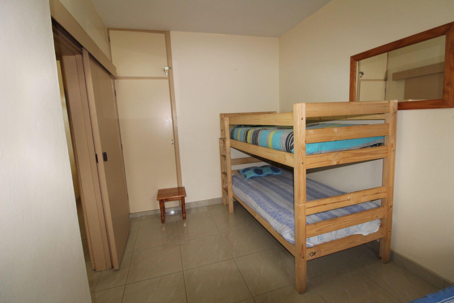 Spindrift 7 is a fully furnished self-catering apartment, located in a secure Margate Beach complex; it can accommodate four adults and one child.This apartment comprises two bedrooms; the first bedroom features a double bed, while the second has a tri-bunk bed (a single bed at the top, and a double bed at the bottom), and there is one bathroom to be shared by guests.The rest of the unit is made up of an open-plan living and kitchen area; the lounge features a ceiling fan and opens out onto a balcony, which overlooks the scenic lagoon, while the kitchen is well equipped