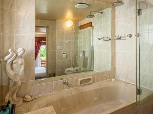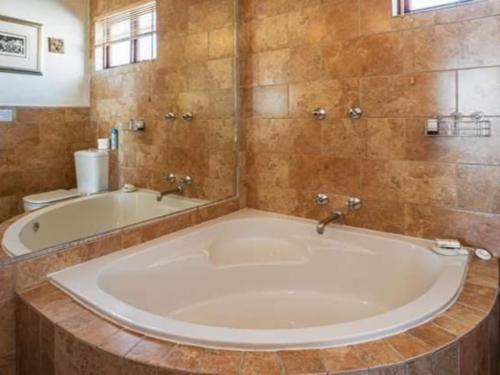 On the ground floor, discover the intimate yet stylish Mid-Level Bedroom en-suite. Indulge in a relaxing spa bath and rejuvenate under the soothing overhead shower. With its own entrance and French doors opening onto a charming veranda, this bedroom is equipped for self-catering, making it a true home away from home. Prepare your own meals with ease using the provided bar fridge, crockery, and cutlery, allowing you to personalize your culinary experience.