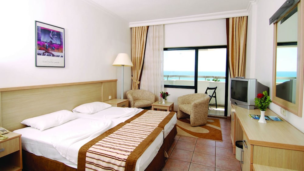 Sural Saray features an outdoor pool surrounded by a palm tree garden, a disco bar and 2 tennis courts. Located directly on the beach, it is 5.6 mi from Side. All rooms are decorated in soft, beige tones and boast a furnished balcony. Plush armchairs, a mini-bar and a TV are provided for each one. Seafood cuisine and meat dishes are served in Sural’s smart-casual restaurant. A range of wines, spirits and nonalcoholic beverages are served at the poolside bar. Hotel Sural Saray is 1.2 mi from Çolaklı. Manavgat is 7.5 mi from the hotel. There is a bus stop right outside the hotel with busses running every 20 minutes. At Sural Saray, guests can relax in the communal TV lounge and watch the latest news. Complimentary internet is available in the reception and the lobby.