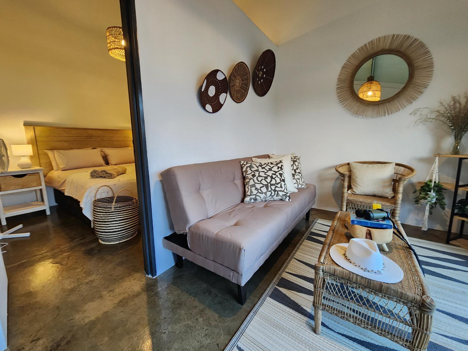 Experience the tranquillity of a farm stay at The Barn at Tembele. We are ideally situated just off the R71 and close to Polokwane’s main mall, private hospitals and schools.The Barn at Tembele offers self-catering accommodation ideal for those who love fine living. Each stylishly furnished room contains comfortable beds, a private en-suite bathroom with a shower, a well-equipped kitchenette and a comfy living area with sofa beds. Sliding doors open to a private patio and small garden area with patio furniture and a braai facility. Free unlimited Wi-Fi internet access is provided.<
